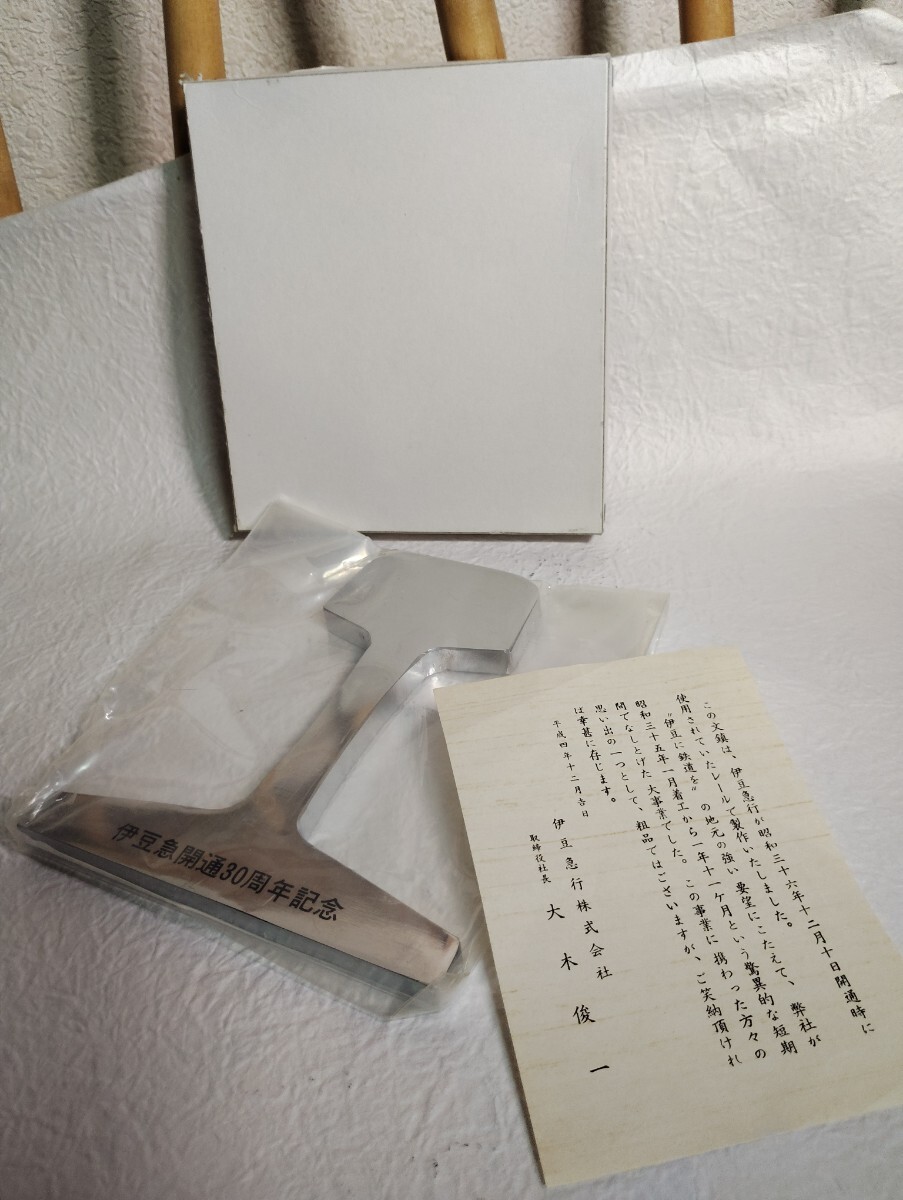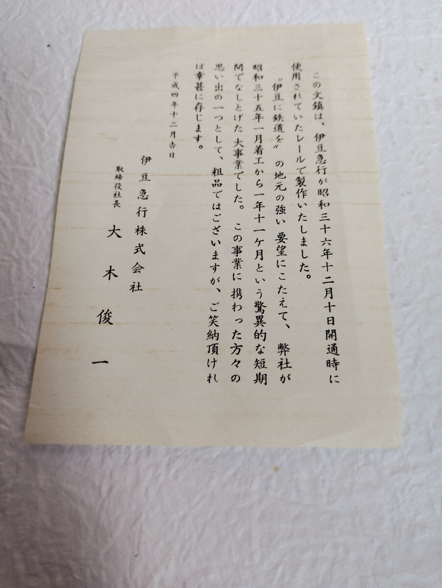 伊豆急行が、昭和36年12月10日開通時に使用されていたレールで製作された文鎮だそうです。