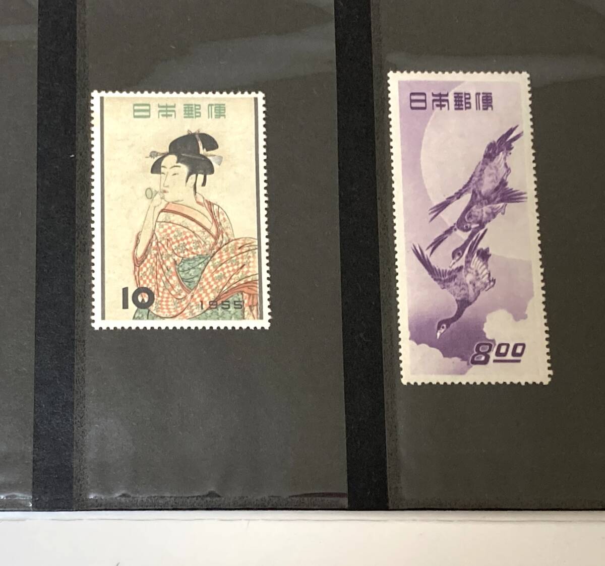 1、切手趣味週間、1948年見返り美人と1949年月に雁、未使用(ヒンジ跡あり)、2枚です。