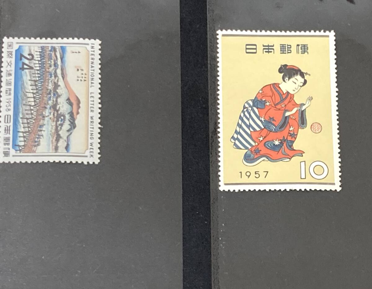 3、切手趣味週間、1955年ビードロを吹く娘、1957年まりつき、1958年雨中湯帰り、未使用(NH)、3枚です。