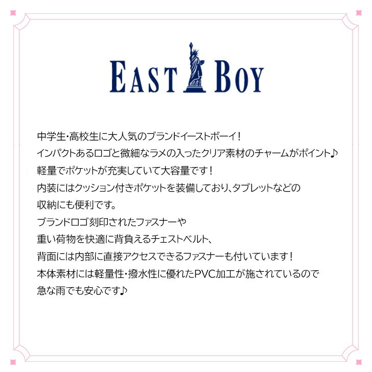 | 商品名 | EBA88【74.パープル】クリア リュック 30L [EASTBOY] [イーストボーイ] |