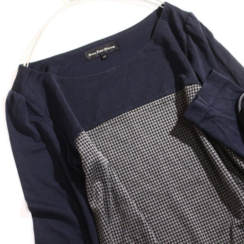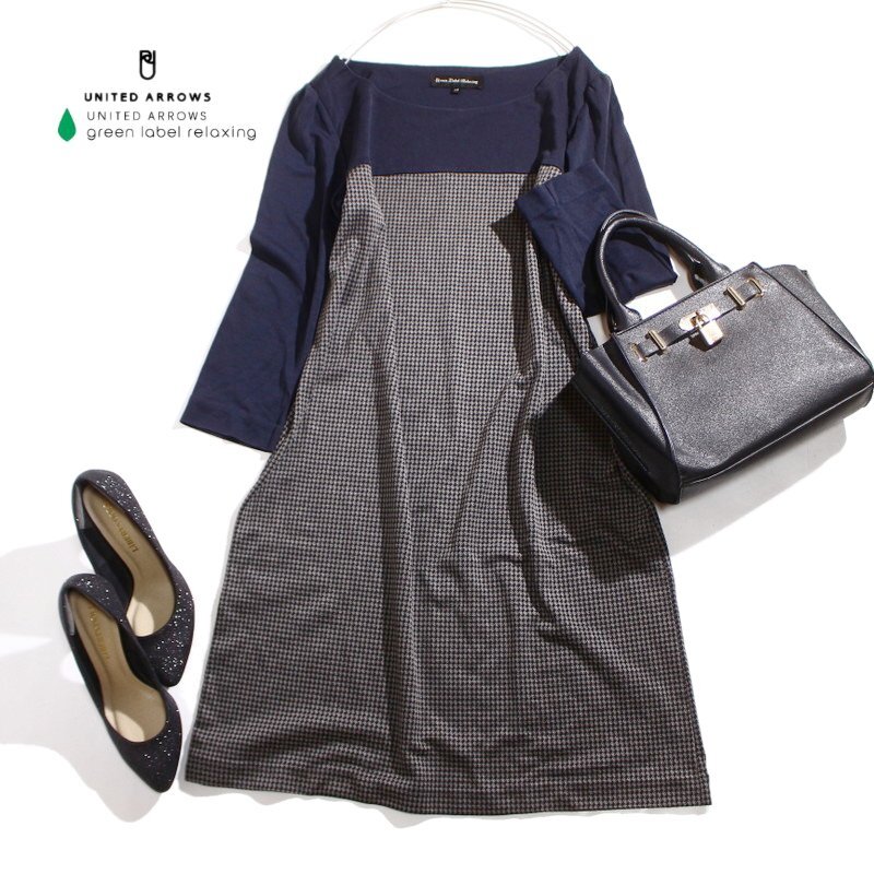 ユナイテッドアローズ グリーンレーベル リラクシングのワンピースです。 トップスはネイビーのカットソー素材、トップ以下はグレー系の落ち着いた柄の異素材を組み合わせた、一枚でコーディネートが決まるワンピースです。パンプスやブーツと合わせてきれいめに、スニーカーと合わせてカジュアルにと、足元や小物で雰囲気を変えて楽しめます。ジャケットやカーディガンを羽織れば、より長いシーズン着用いただけます。