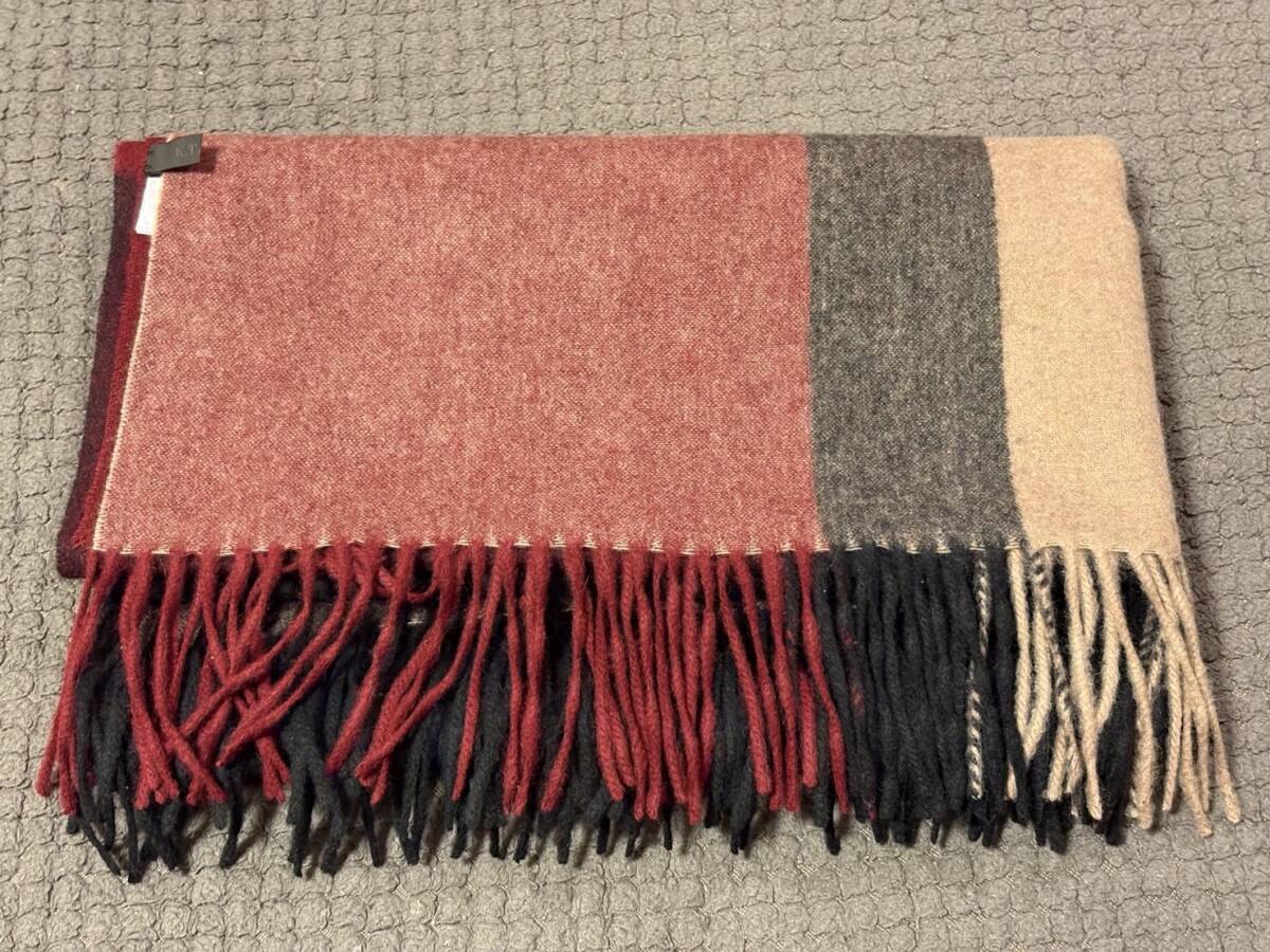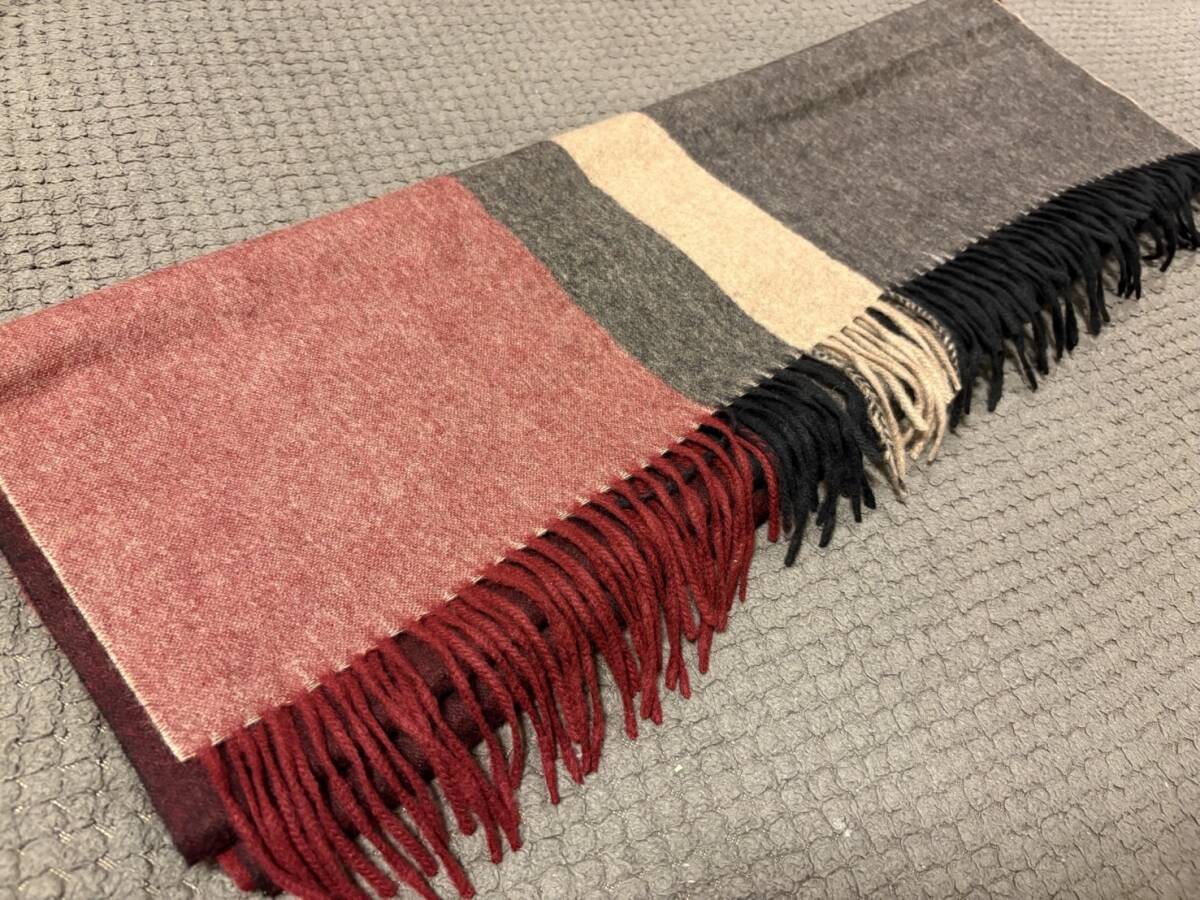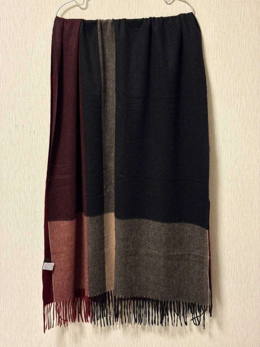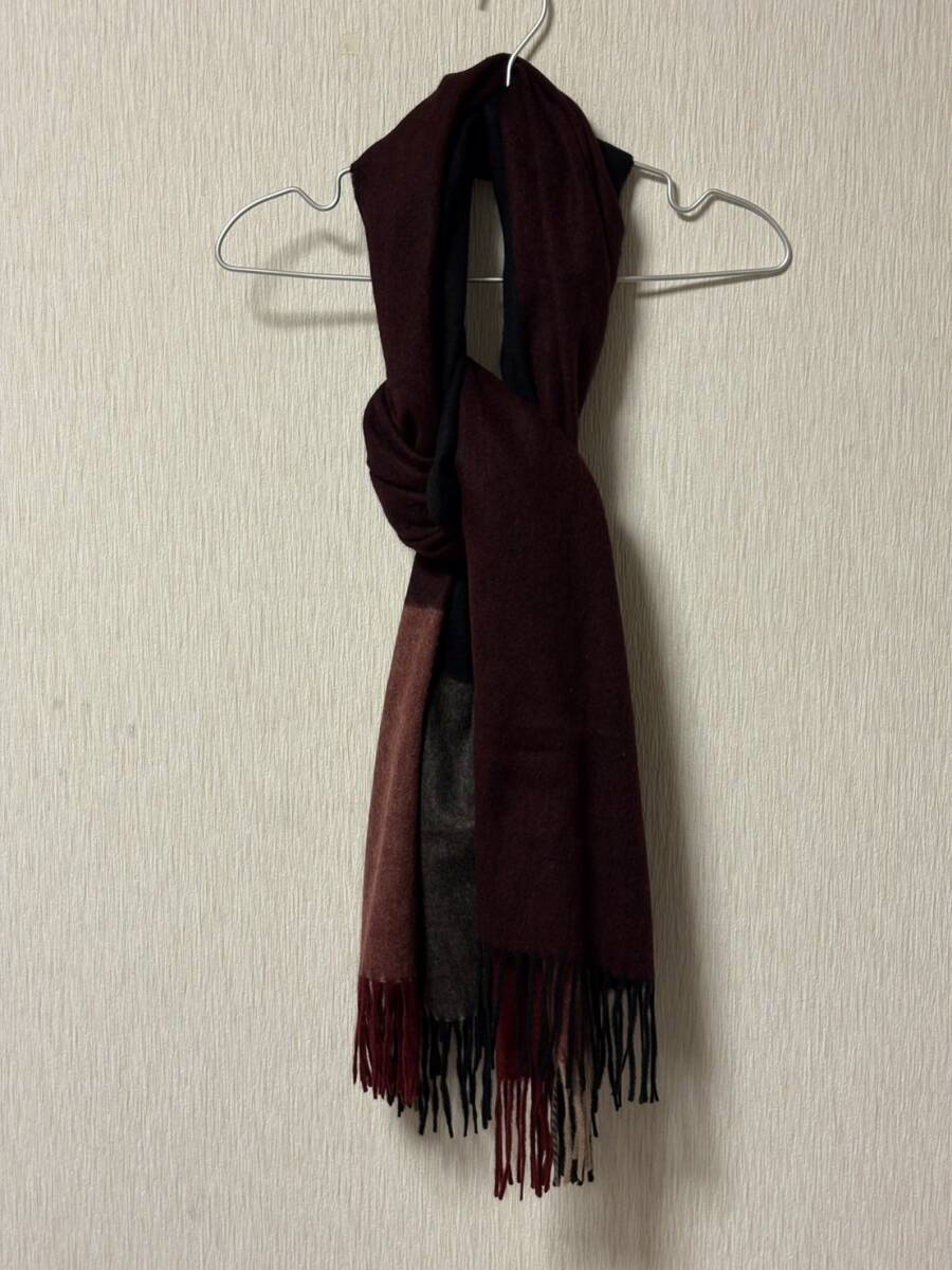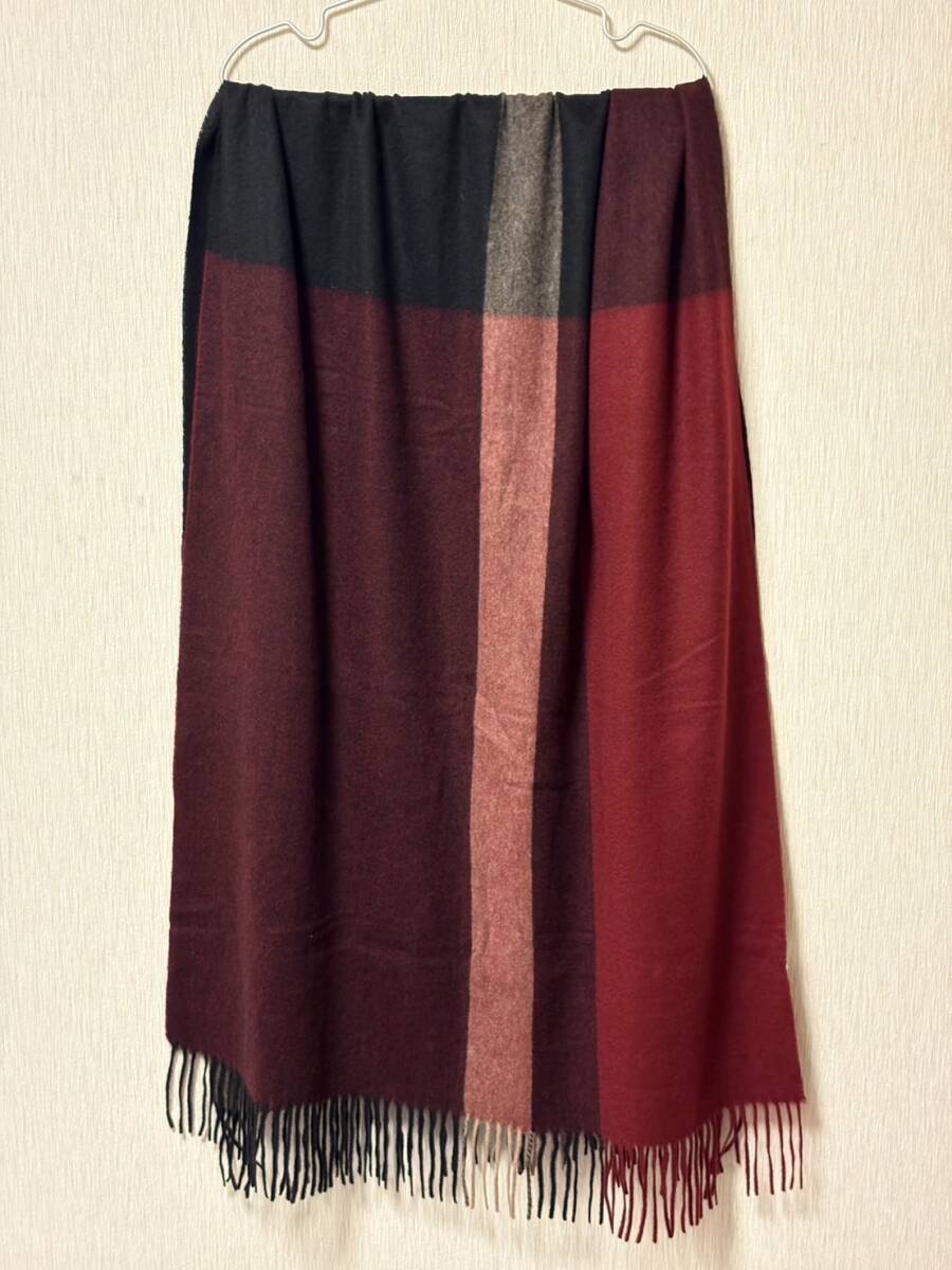 □ ケーティーの大判マフラーです。色は赤エンジ黒ベージュでカシミヤ100です。いかがでしょうか。