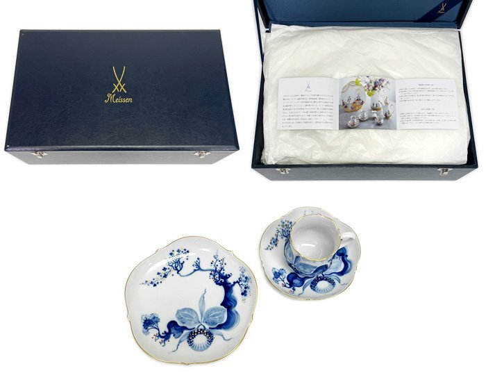 未使用 Meissen マイセン ブルーオーキッド カップ ソーサー プレート 1客セット 2001年 限定 モーニングセット 金彩 金縁 西洋磁器 箱付