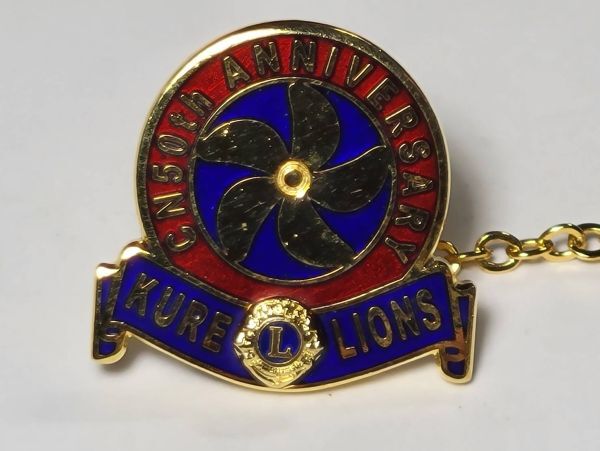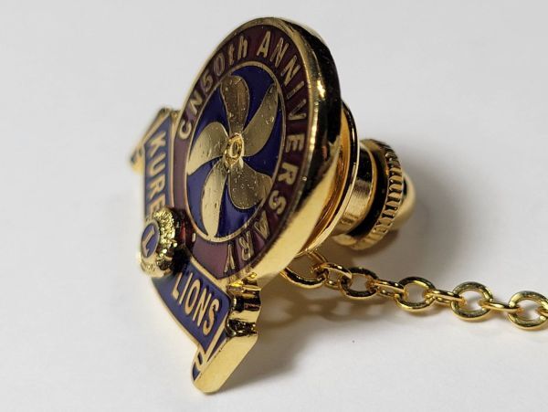 ブルーレッドの色枠に「KURE LIONS」「50th ANNIVERSARY」の文字が刻まれ中央にスクリュー、青いLのエンブレムが特徴的なチェーン付きラペルピン(タイタック)になります。