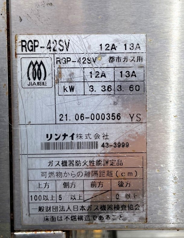 | 製品名 AA-99 業務用 リンナイ 上火グリラー ペットミニ RGP-42SV 21年製 都市ガス用 W500xD315xH400 店舗用品 中古 厨房 |