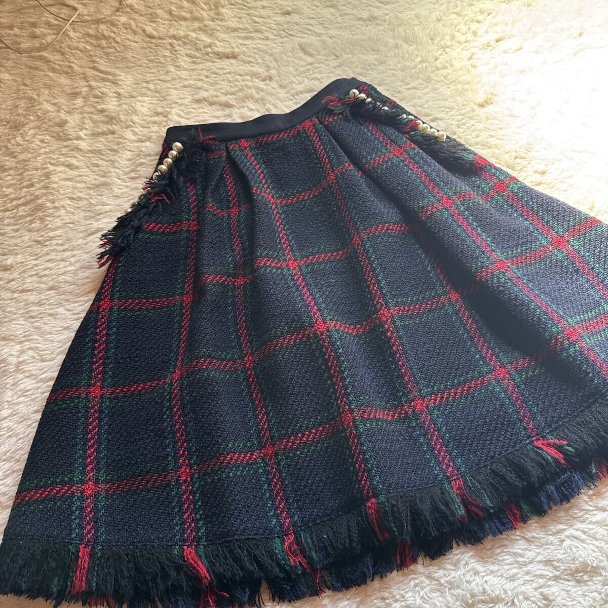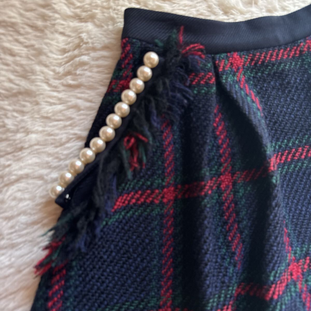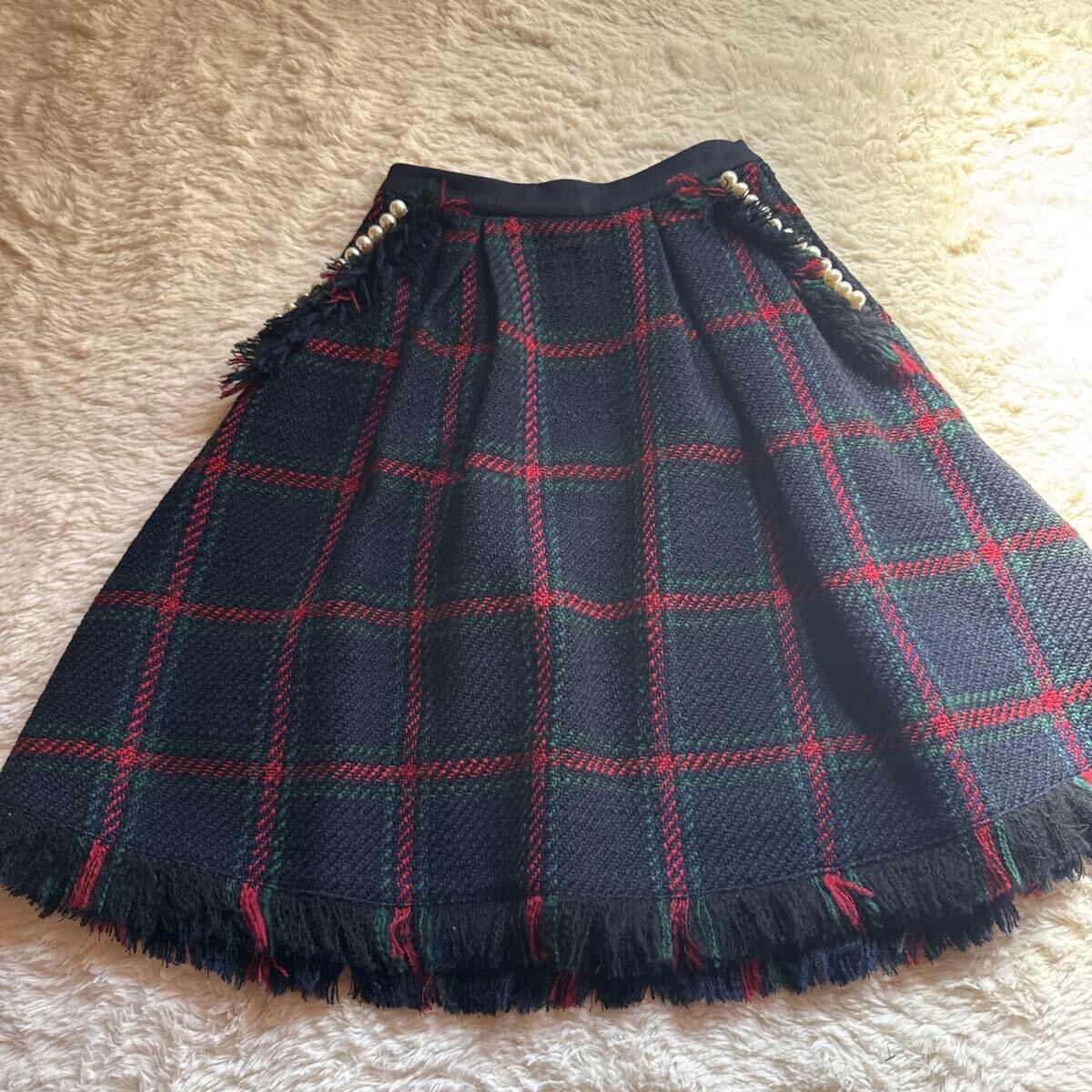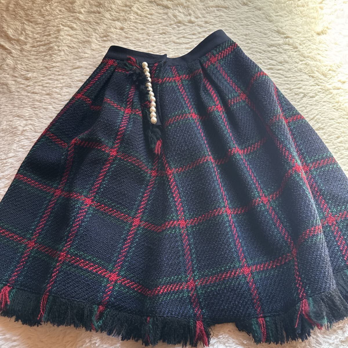ネイビーを基調にレッドとグリーンの鮮やかなストライプが織りなす、秋冬のワードローブに欠かせない存在感。ウール混の柔らかな素材が肌に優しくフィットし、軽やかなプリーツが歩くたびに優雅に揺れるシルエットで、日常からパーティーまでシームレスに活躍します。