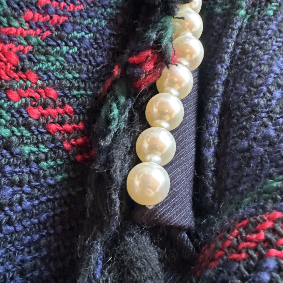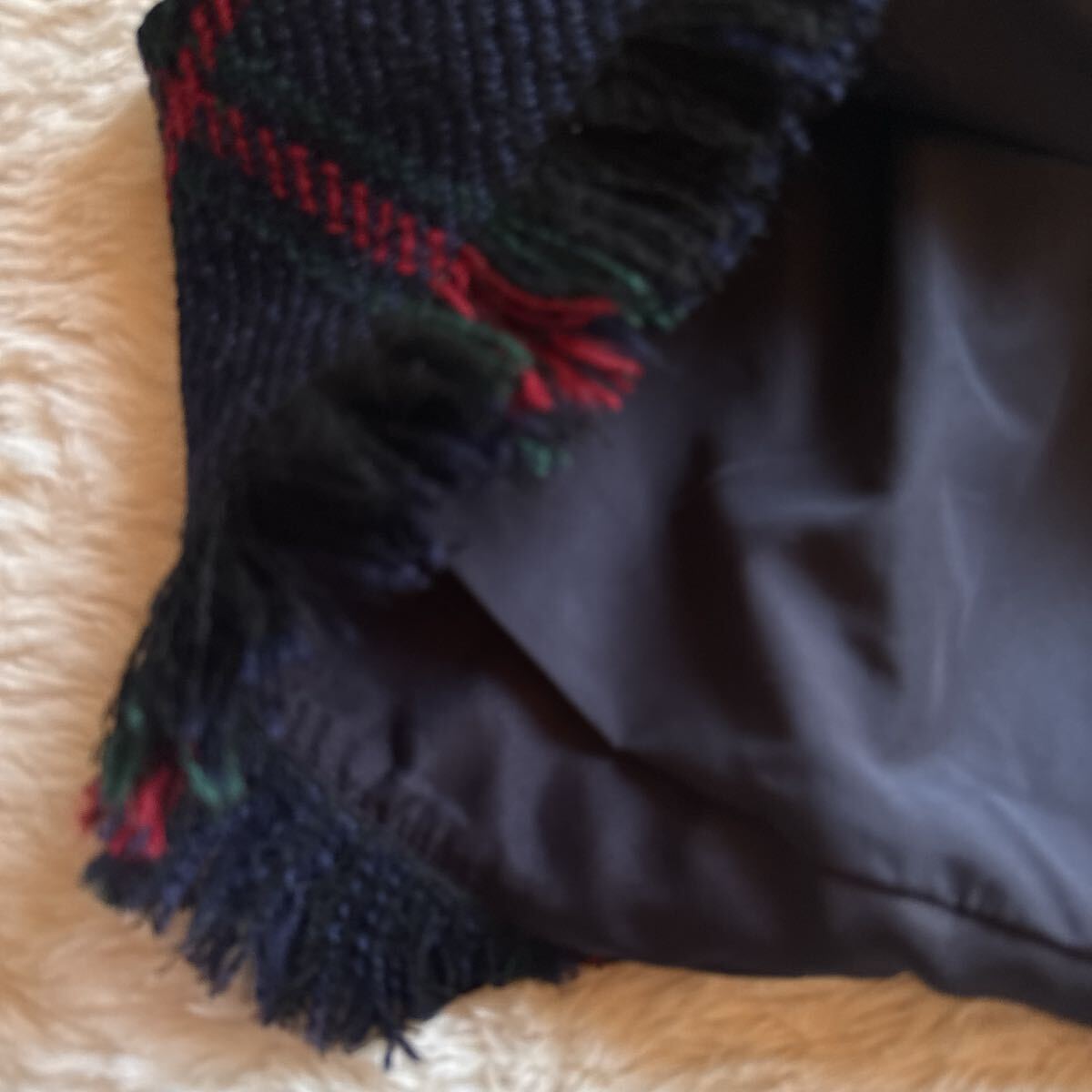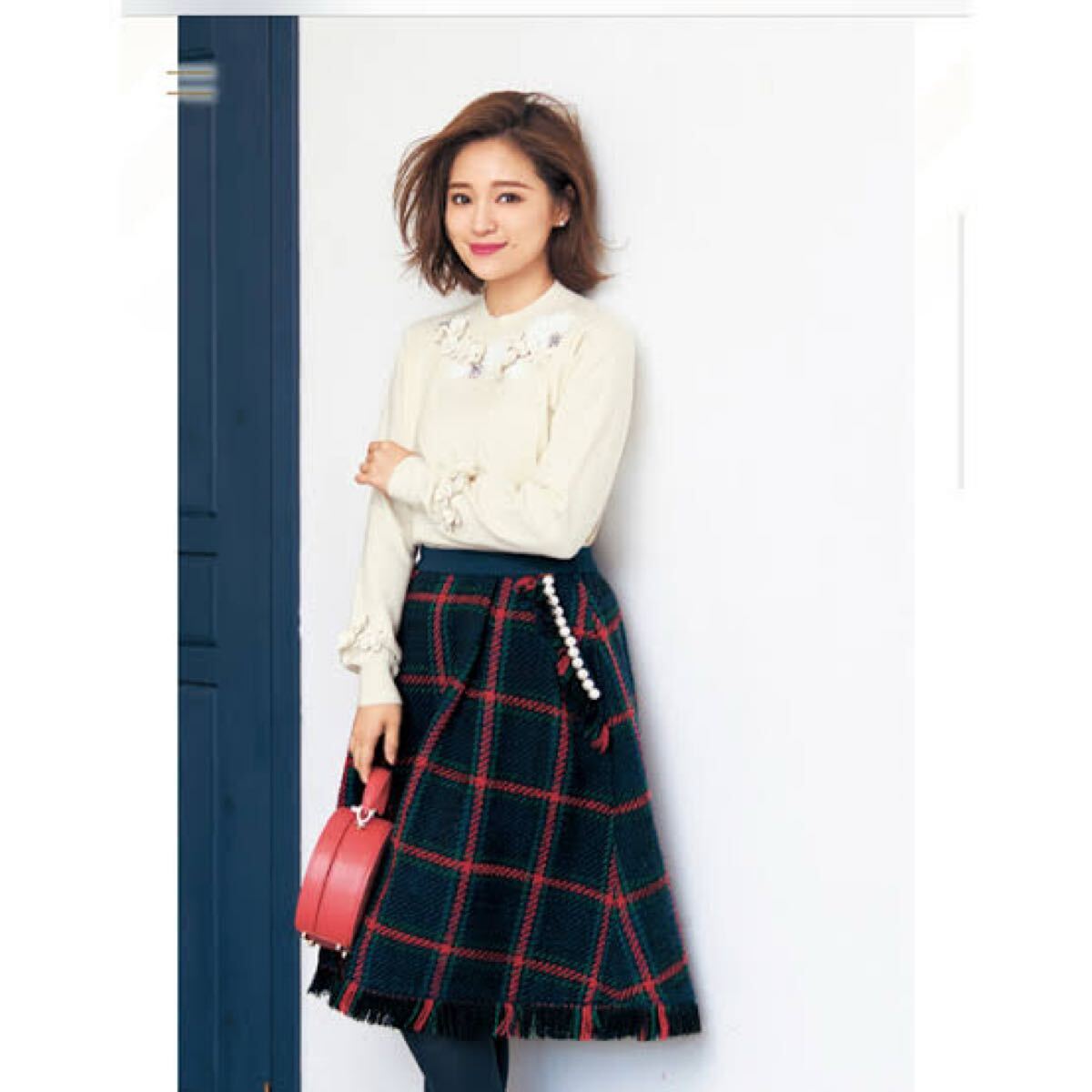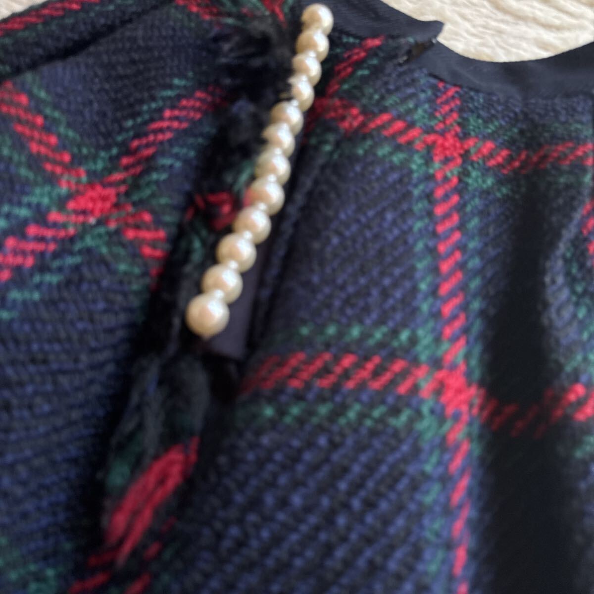 ネイビーを基調にレッドとグリーンの鮮やかなストライプが織りなす、秋冬のワードローブに欠かせない存在感。ウール混の柔らかな素材が肌に優しくフィットし、軽やかなプリーツが歩くたびに優雅に揺れるシルエットで、日常からパーティーまでシームレスに活躍します。