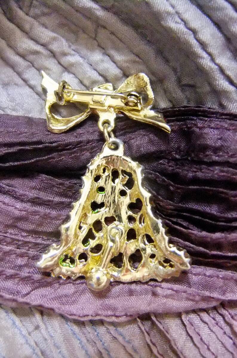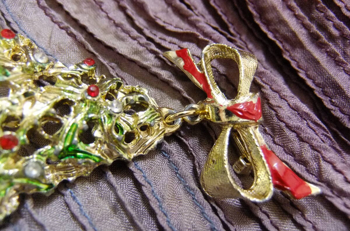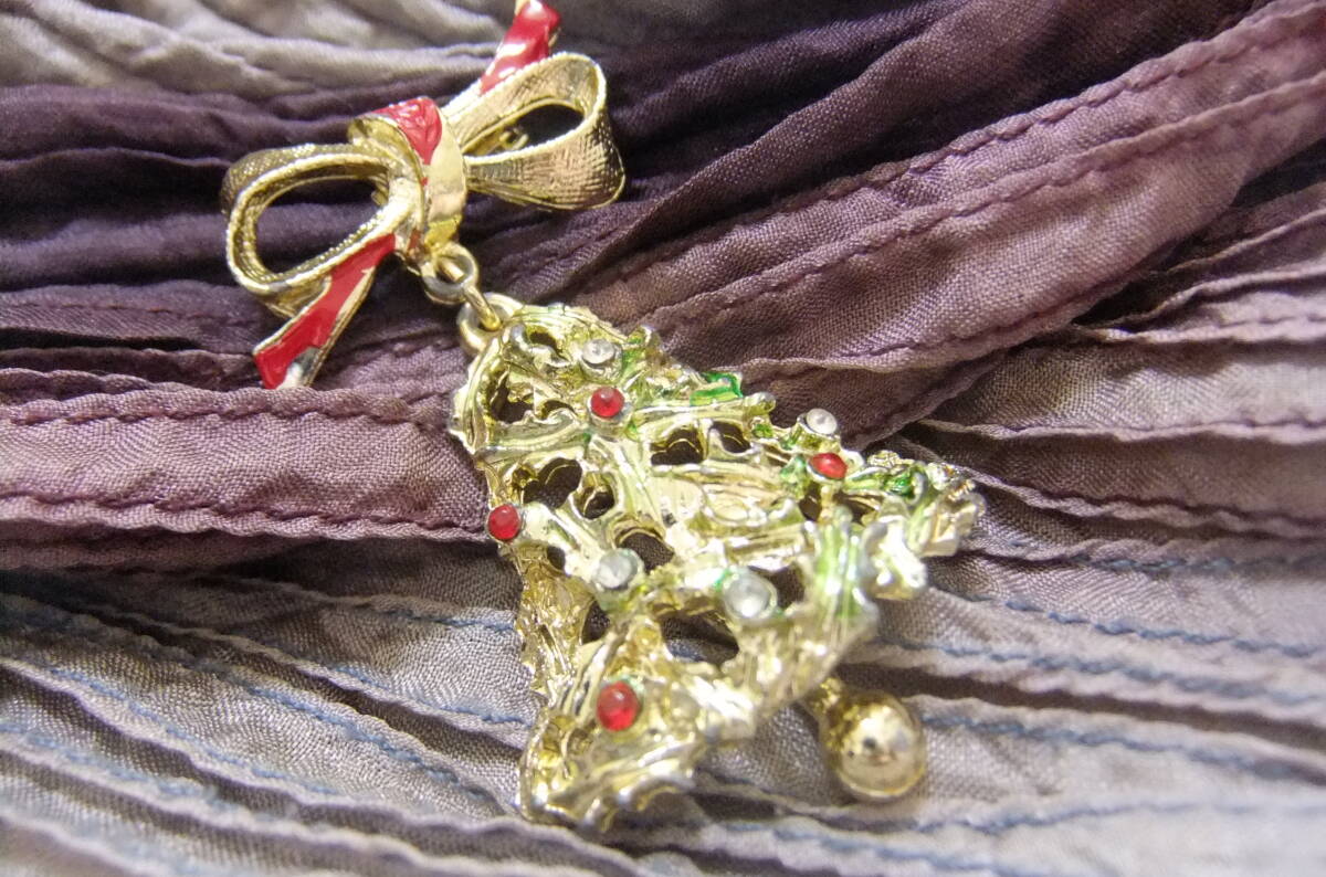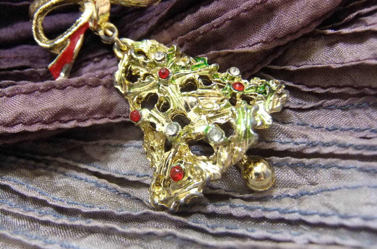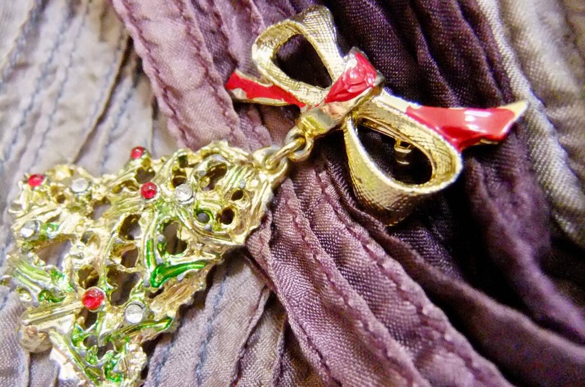 ヴィンテージ品、リボン、柊とベルの2色カラーストーンブローチ。