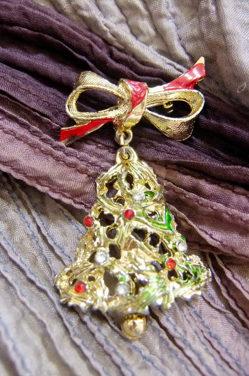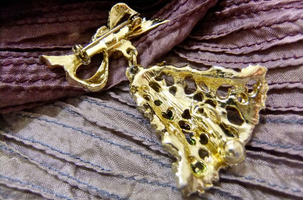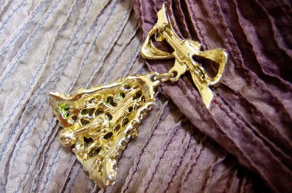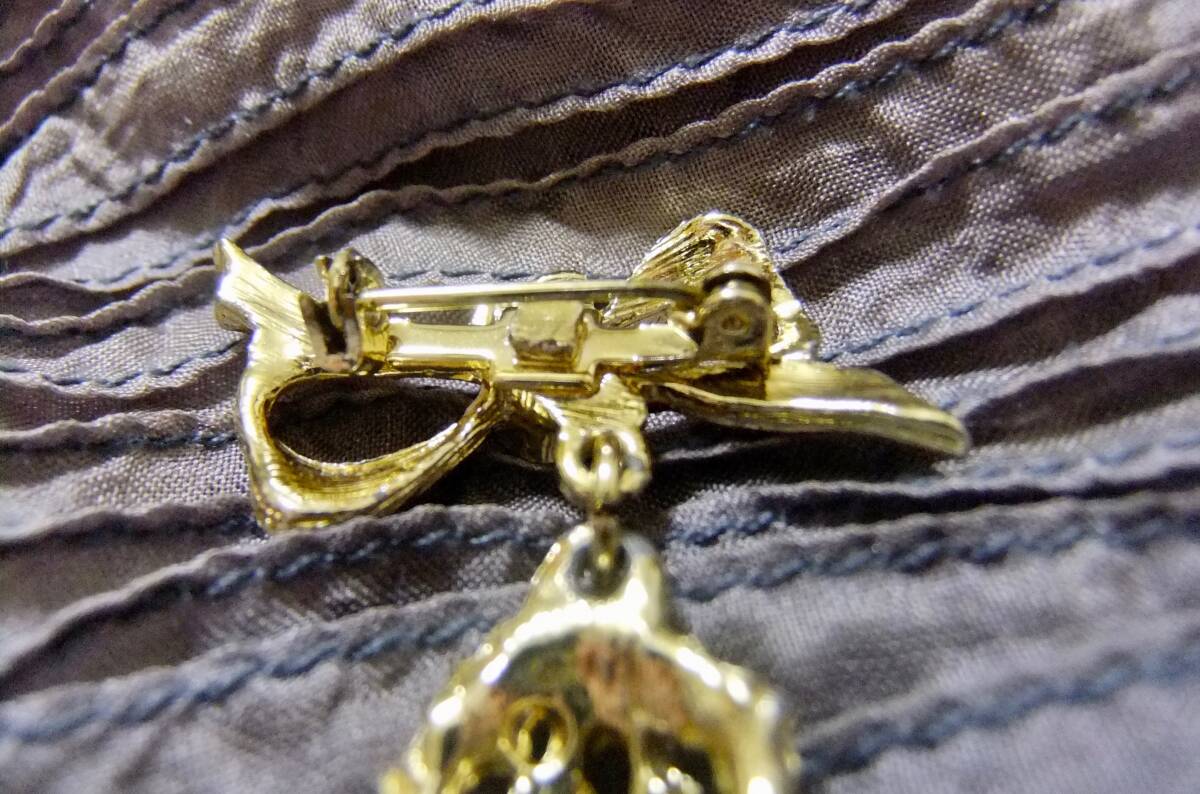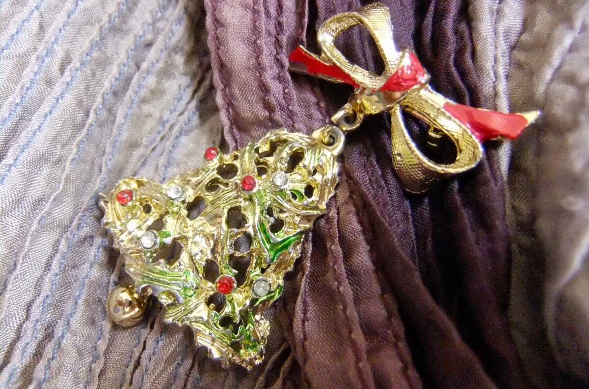 ヴィンテージ品、リボン、柊とベルの2色カラーストーンブローチ。