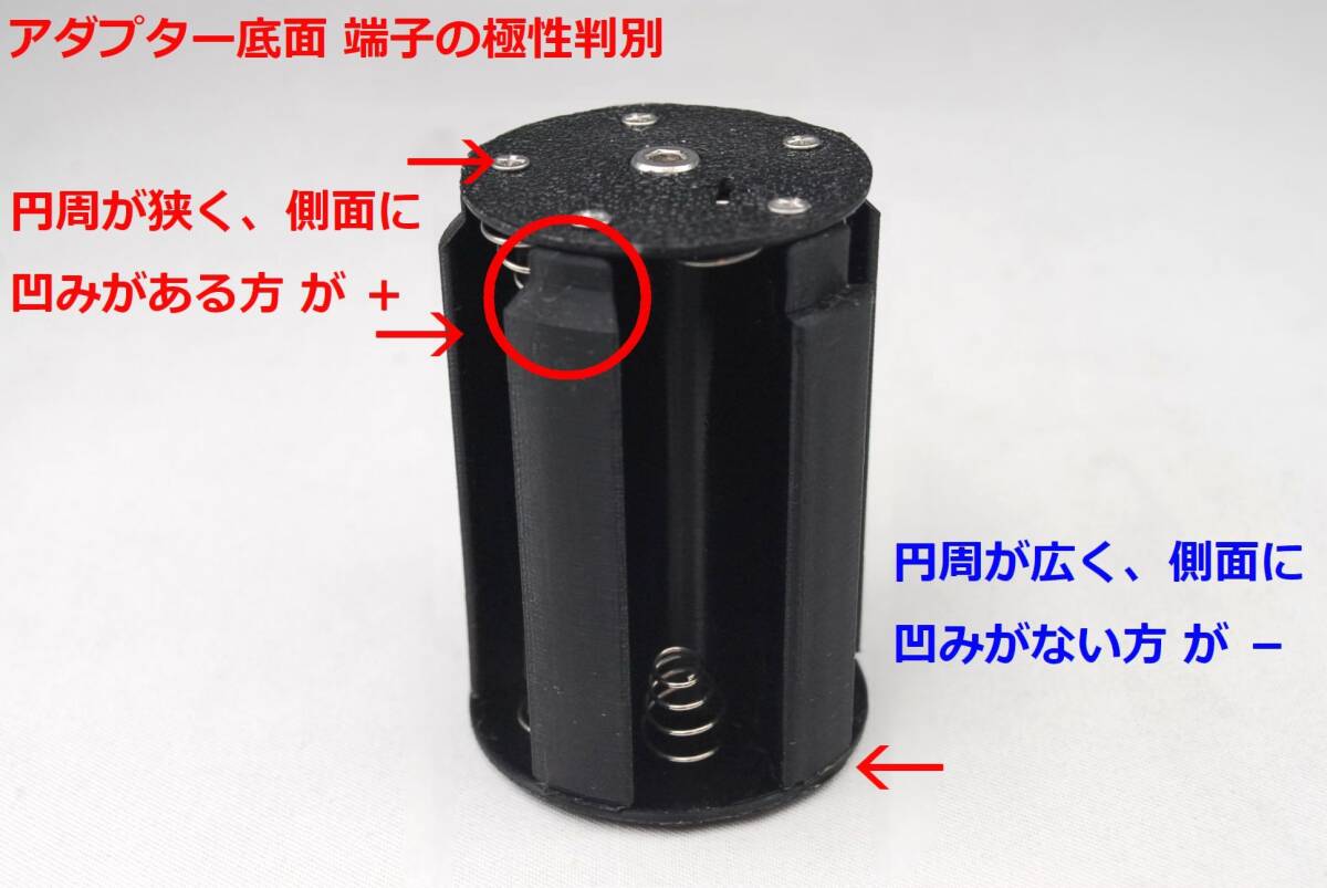 ※極性の判別について、バッテリーアダプター(円筒形)の構造をご確認ください。底面(カメラ側と接続する端子がある面)で、 金属端子がある面の円周が 狭い方が「プラス(+)」、広い方が「マイナス(-)」 となります。