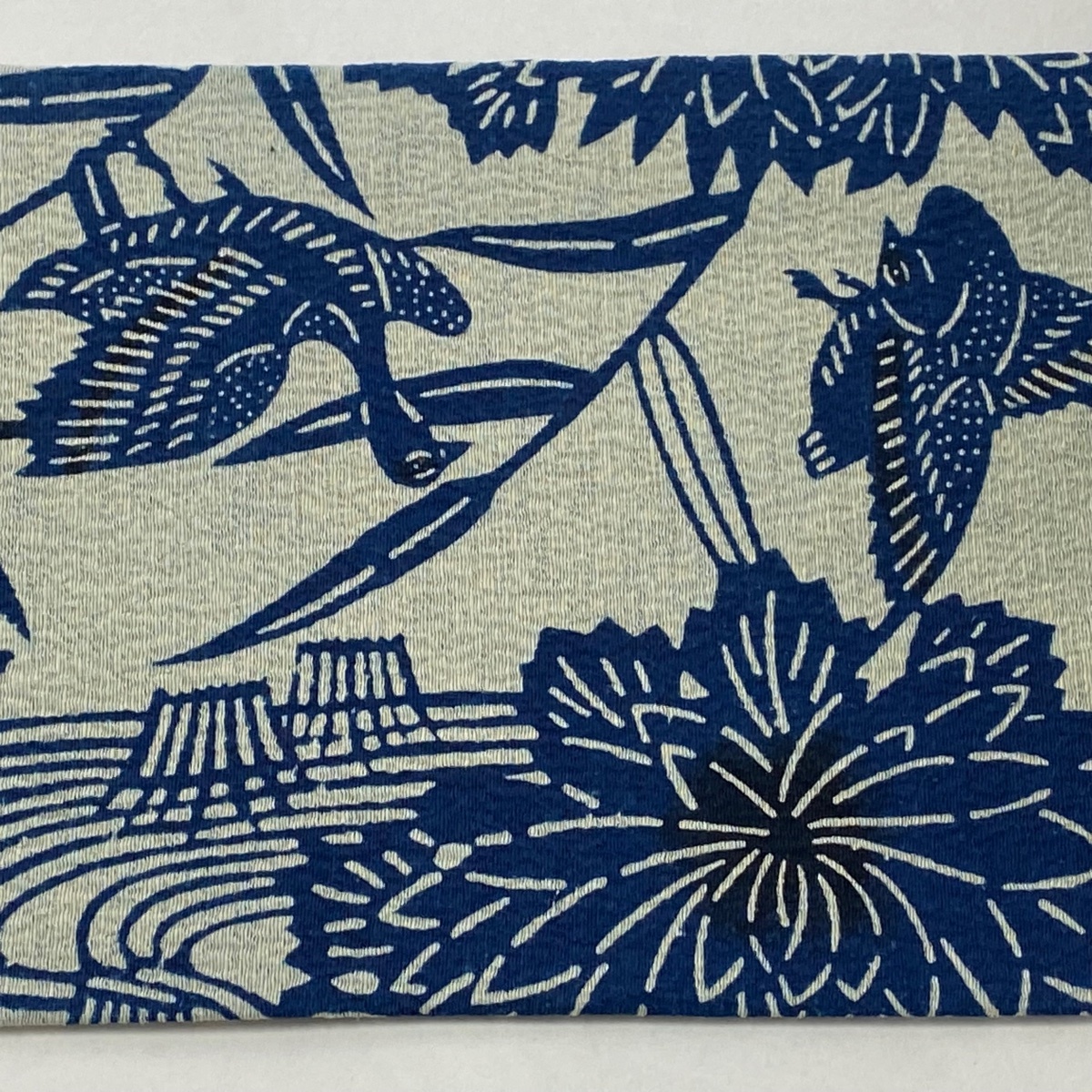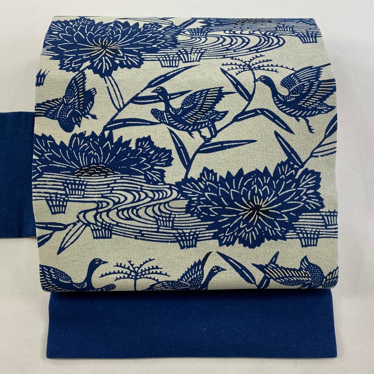 | 名古屋帯 秀品 紬地 花鳥 流水 紺色 正絹 【中古】 |