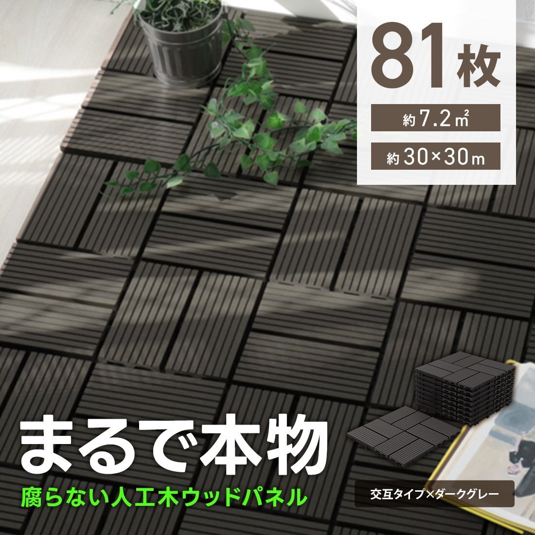 | パズルみたいにサイドの凹凸を繋ぎ合わせるだけで簡単に施工が出来るジョイント式ウッドタイル! ベランダの雰囲気を変えたり劣化してきたベランダの修復に最適! 雨や日差しによる劣化に強く耐腐食性もある人工木を使用。 55%の天然木粉と45%の樹脂で出来ており、天然木製と比べると定期的なお手入れも不要! 小さなお子様やペットにも安心。さらっとした感触でささくれや釘による怪我の心配もなし。 安全に長期間使用できる優れものです! 【商品詳細】 カラー:ダークグレー(交互タイプ) 表面のサイズ(約):幅29.5cm×長さ29.5cm×高さ2cm ジョイント部分も含んだサイズ(約):幅30.5cm×長さ30.5cm×高さ2cm 表面隙間:5mm 重量(約):0.9kg 圧力強度:3000N 材質:WPC素材(木材・プラスチック複合材) 表面・・・人工木(天然木の木粉55%入り) 裏面・・・ポリプロピレン樹脂 【商品内容】 ウッドパネル × 81 |