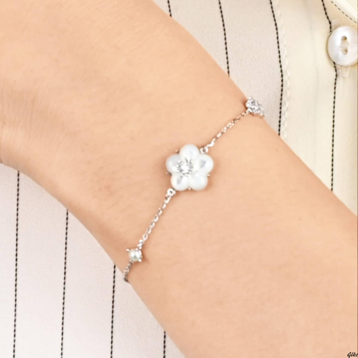 白蝶貝のやわらかな輝きが手元を上品に照らす、花モチーフのシルバーブレスレット。