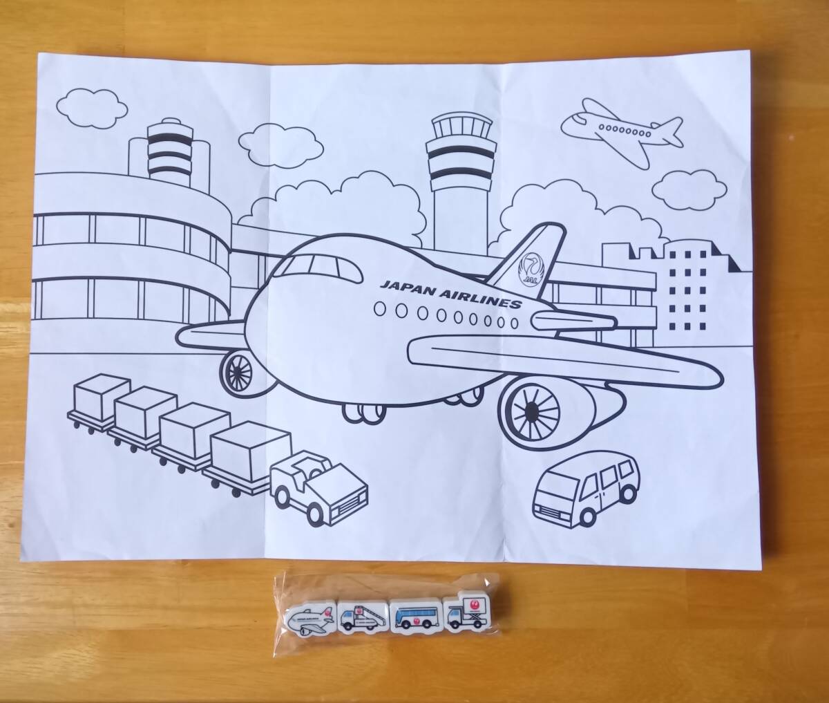 未使用JAL ぬりえセット(消しゴム・クレヨン3色付)と ぷくぷく3Dシールのセットです。