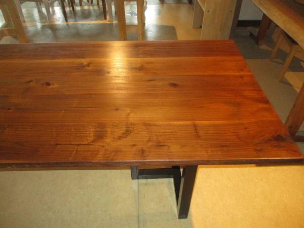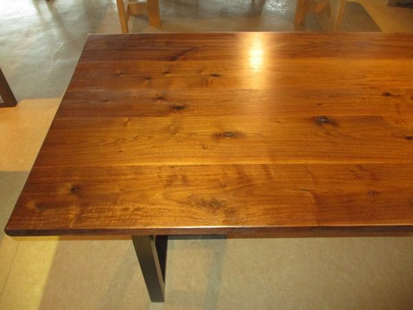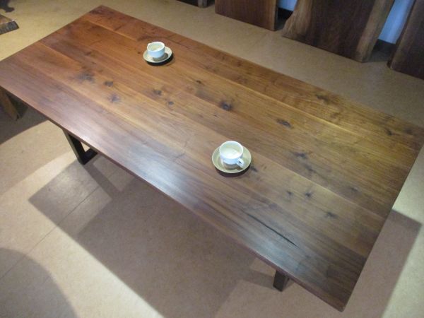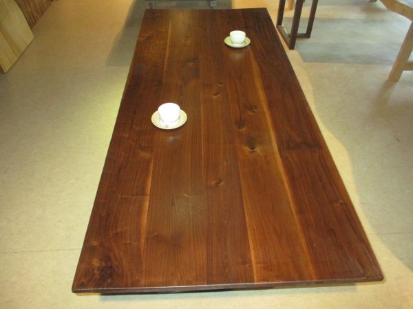 ウォールナットのテーブルです。ブラックウォールナットです。5枚の板を接ぎ、1枚の幅広のテーブルに仕立てました。使い勝手が抜群です。まだ撮影のための一次塗装しか施しておりません。この後、最終仕上げに入ります。よりきれいになります。