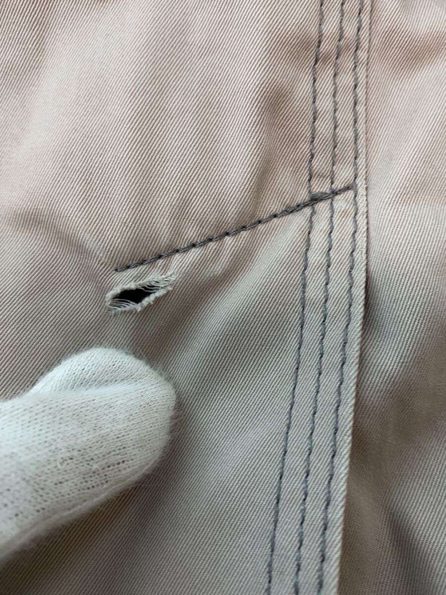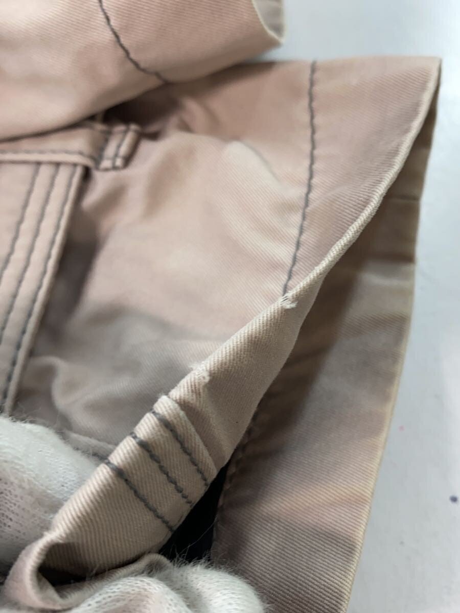 | 襟や袖口に汚れ、袖口にスレ、後ろベンツに破れ等ございます。ベルトの欠品。 |