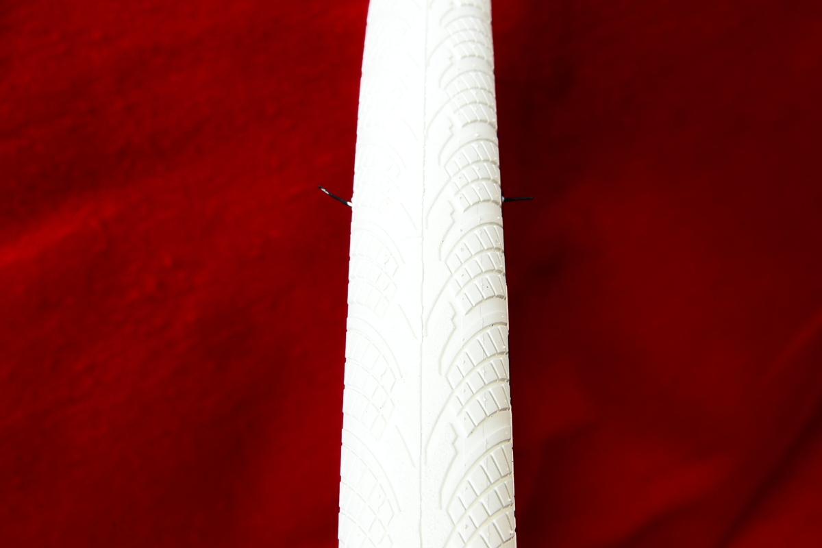 折り畳みタイヤではございませんが、平らに積んで保管しておりましたので、自由状態ではケーシングに折り畳み跡がついております。エアを入れれば使用に影響はございません。