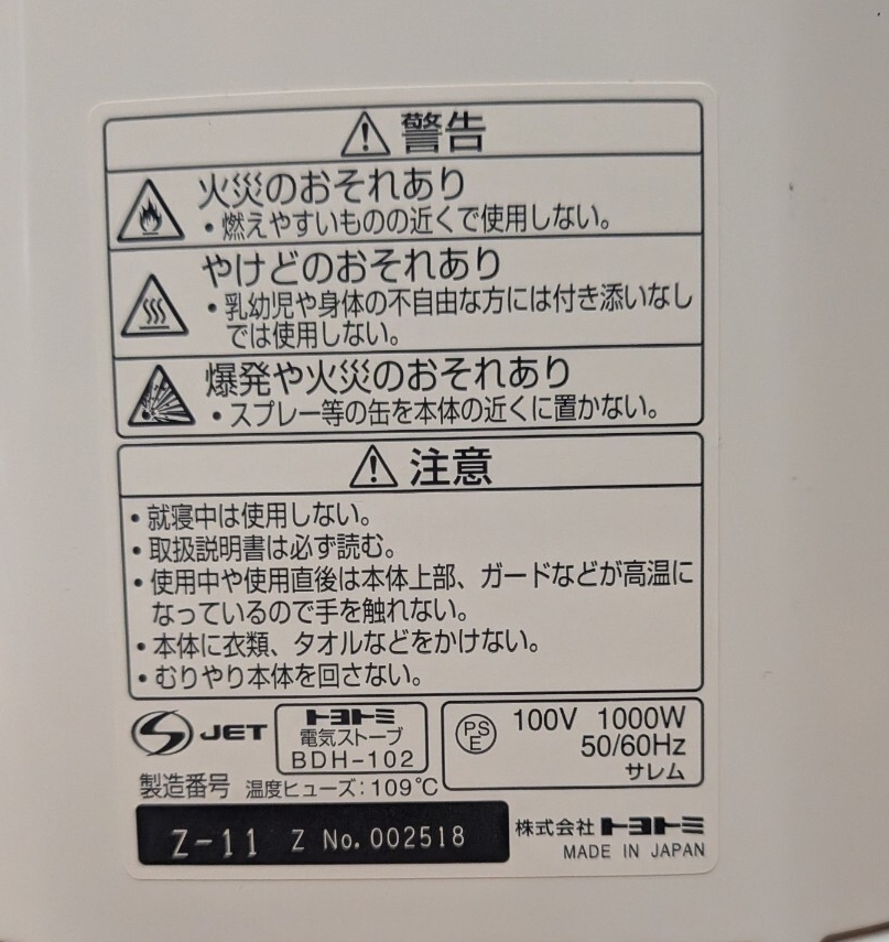【トヨトミ TOYOTOMI 電気ストーブ ホワイト《BDH−102動作確認済】