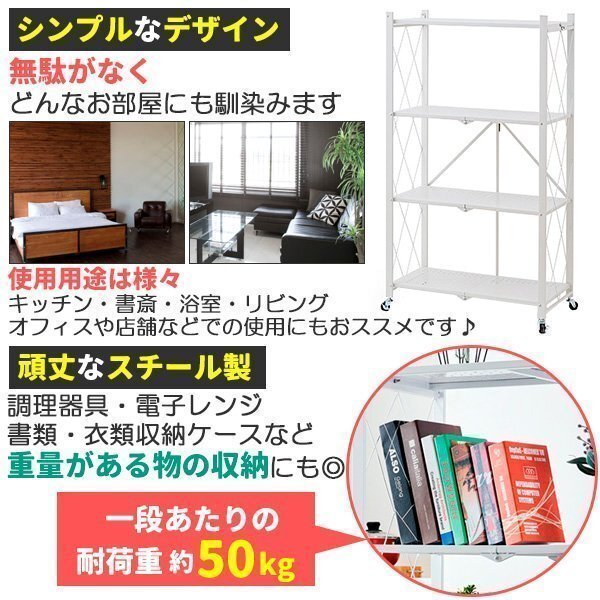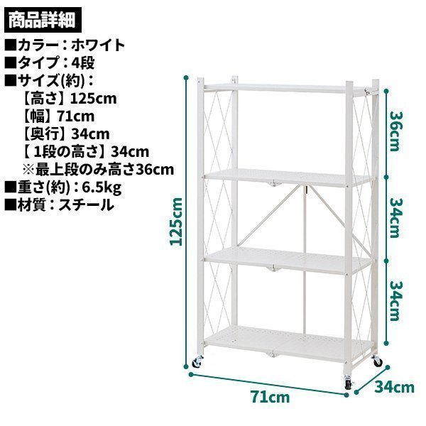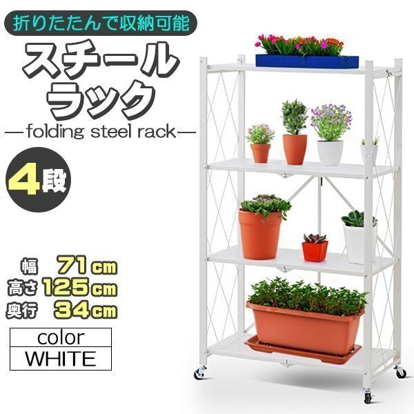 収納ラック 棚 金属シェルフ スチールラック メタルラック 折りたたみ 折り畳み スチール棚 キャスター付 組立簡単 頑丈 ホワイト 白 4段