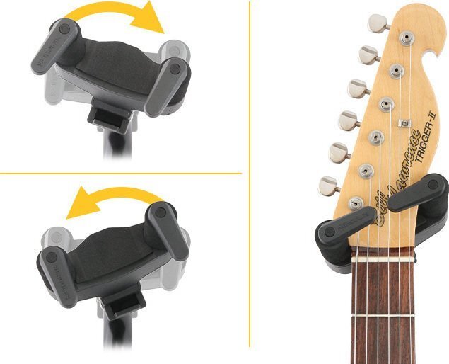 細身のヘッド形状にも確実にフィット:スイベル式のハンガーによって、ヘッドの形状に合わせて回転するため、ギター本体に負荷をかけることなくロックすることができます。