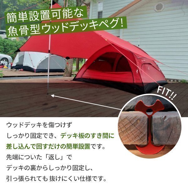 ウッドデッキキャンプサイトでのテント設営、お庭のウッドデッキでのオーナメントの固定にもオススメなペグです。カラー:レッド