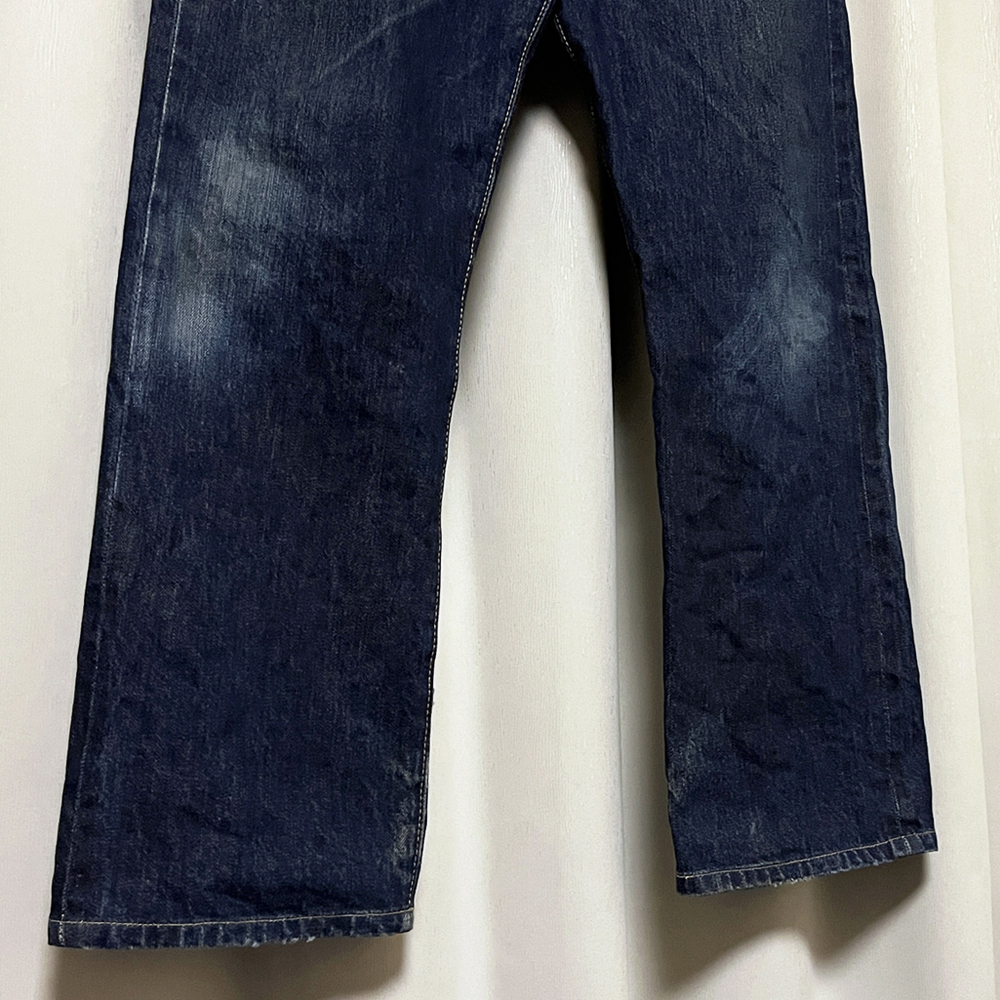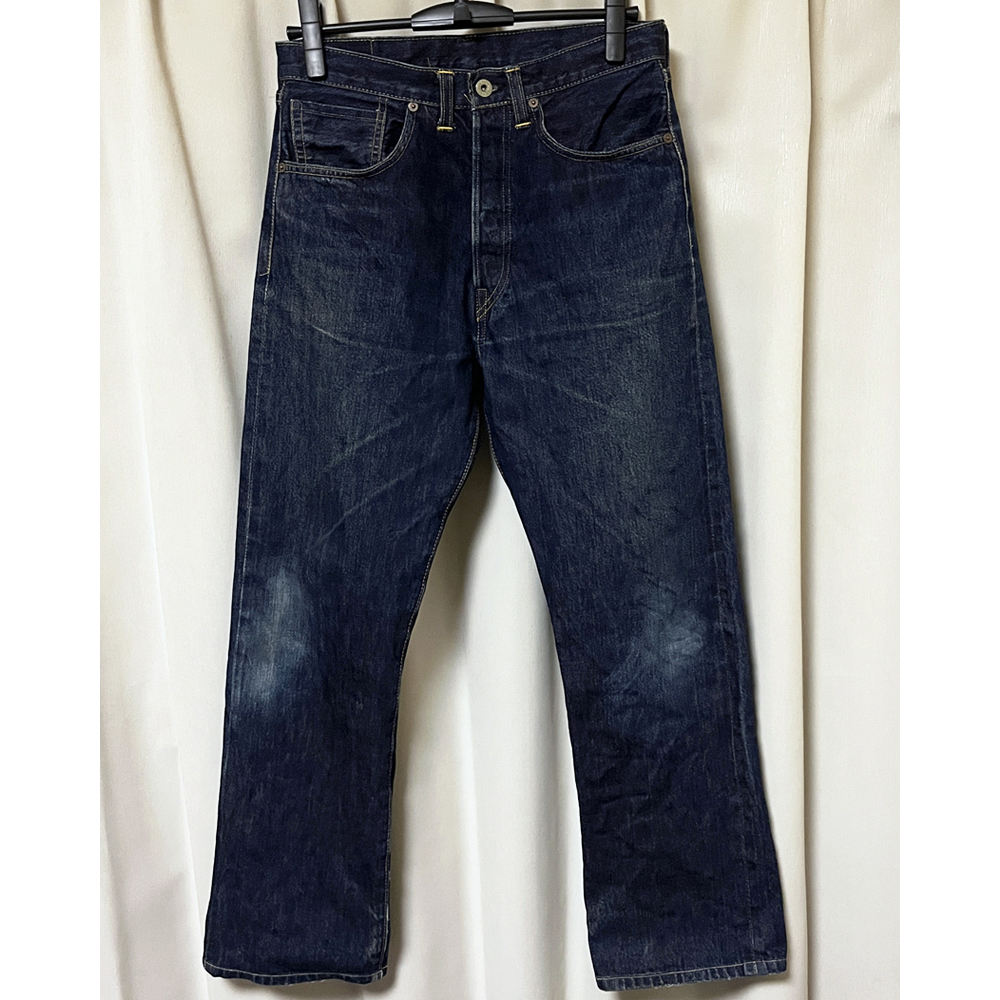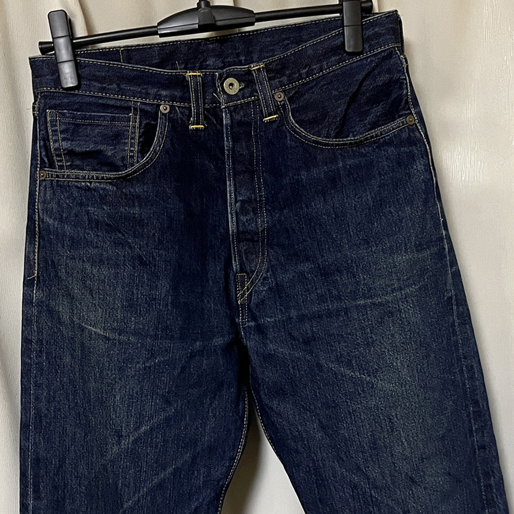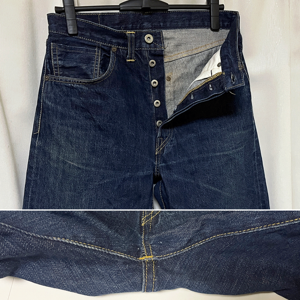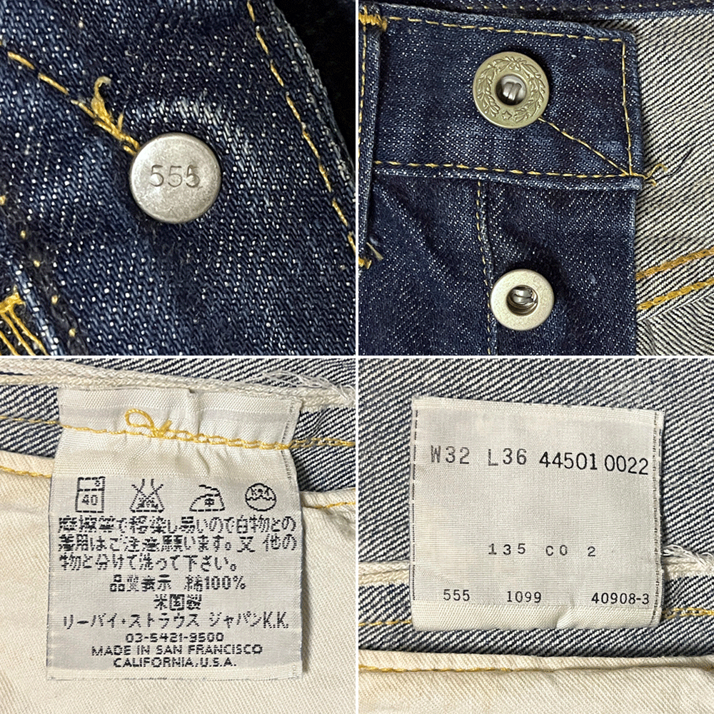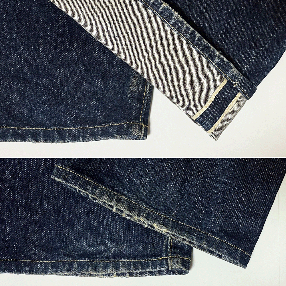 フロントは月桂樹ボタンを使用したボタンフライ、ボタン裏「555」、隠しリベット付き、コインポケット裏に耳付き、革パッチ、セルビッチ付き。