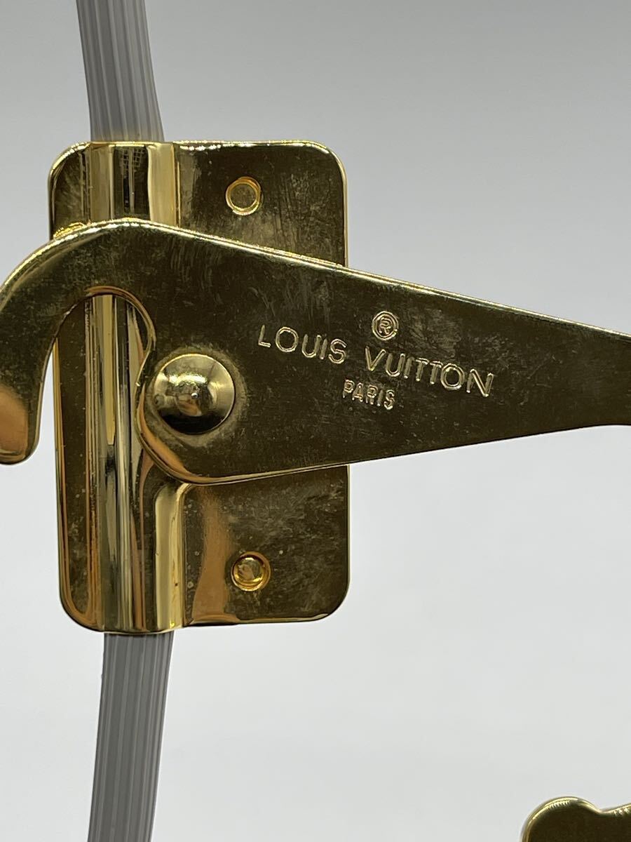 It features a brown fabric cover with the LOUIS VUITTON logo and a gold-tone hanger with the engraved brand name.