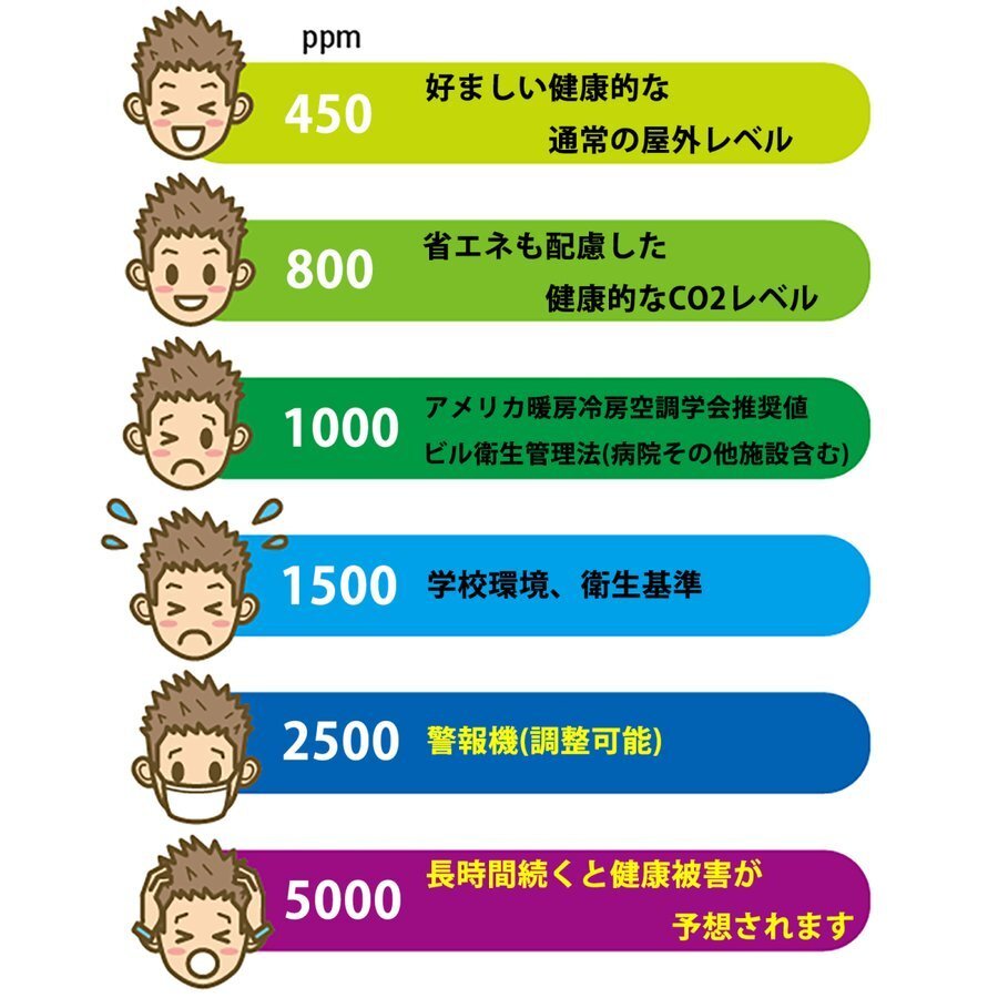 顔文字と数値で二酸化炭素濃度の状況を一目で確認できます。