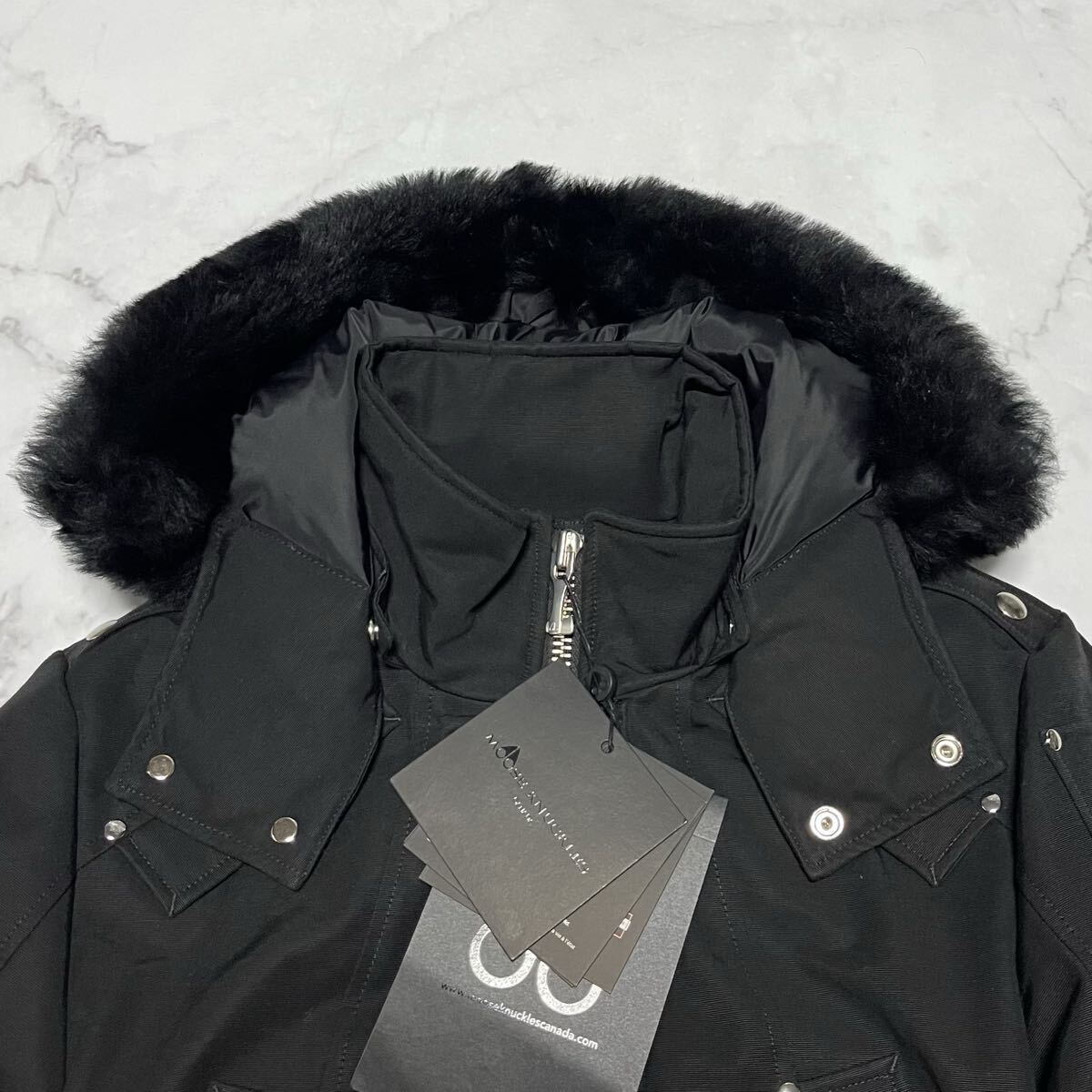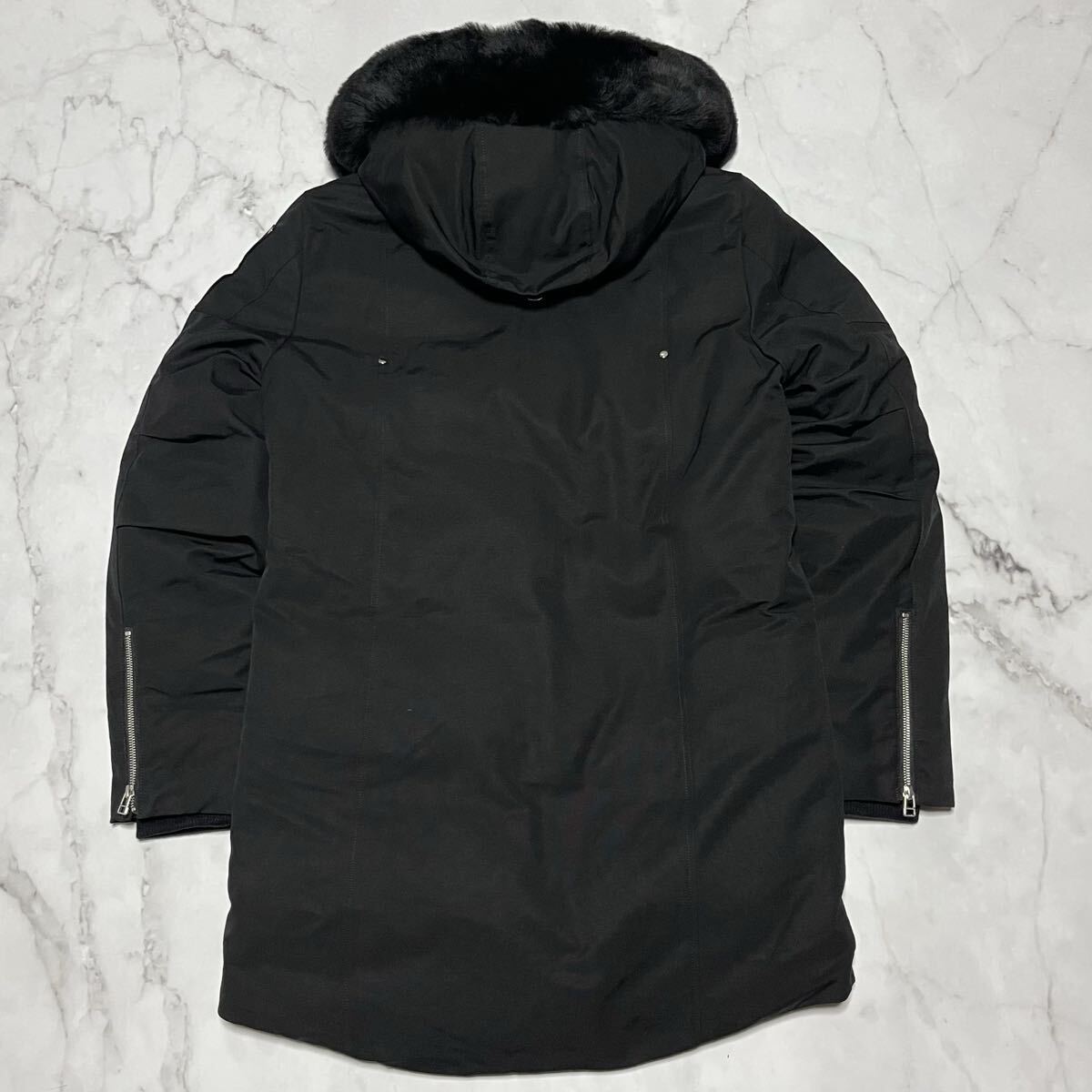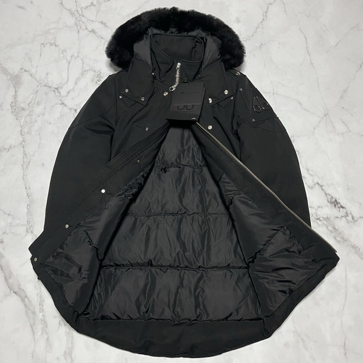アイコニックなロゴがあしらわれたアームのディテール、贅沢なファー付きのフード、そしてジップ&スナップボタンによるフロントの重厚な仕様など、細部までブランドのこだわりが詰まっています。