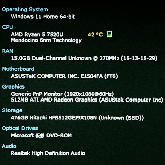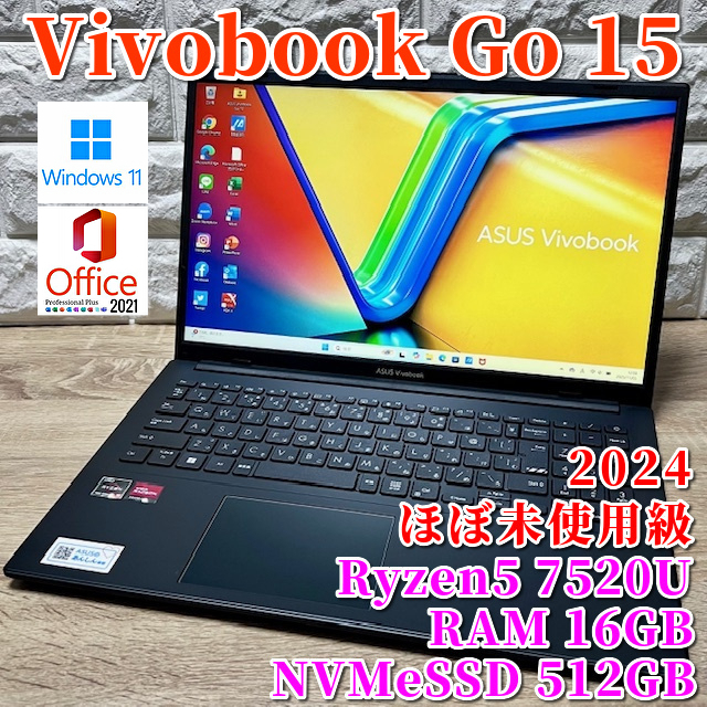 2024年製《ほぼ未使用級》【 ASUS Vivobook Go 15 E1504FA 】AMD Ryzen5 7520U!NVMeSSD512GB!RAM16GB!カメラ/Wi-Fi6E対応/MSOffice2021