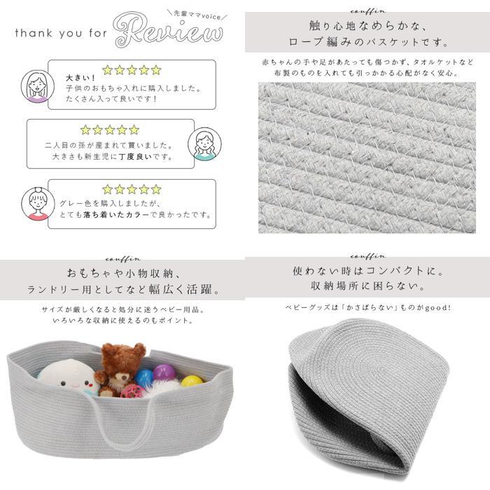 | 商品説明 | ・・赤ちゃんがゆっくりお休みできる♪ベビーバスケットが発売。 ・触り心地なめらかなロープ編みのバスケット。赤ちゃんの手や足があたっても傷つかず、タオルケットなど布製のものを入れても引っかかる心配がないから安心。 ・使わない時は折りたたんで、コンパクトに収納可能。持ち手付きで、持ち運びもラクラク。 ・ベビー用のクーファンとしてだけでなく、お子さまのおもちゃや小物収納、ランドリーバスケットとしてなど幅広く活躍。 ・シンプルなデザインに、インテリアの邪魔をしないベーシックカラーをラインナップ♪ |