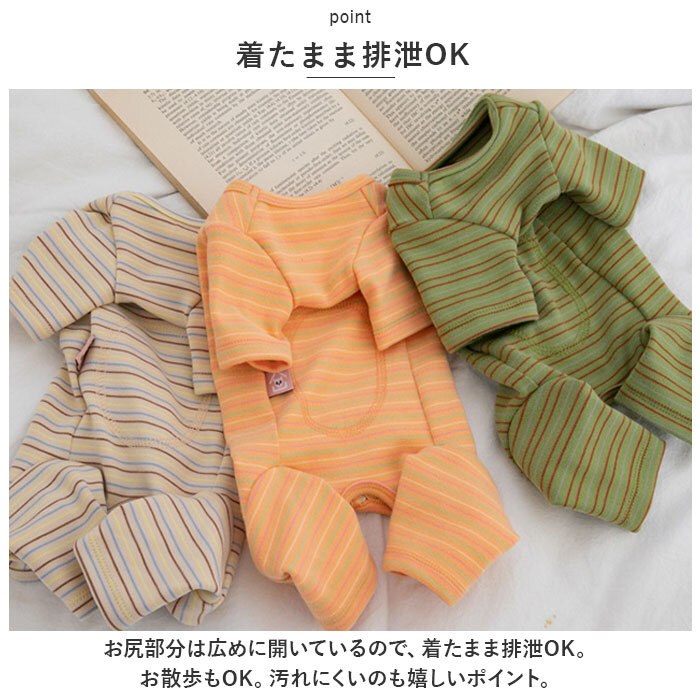 ・お尻部分は広めに開いているので、着たまま排泄OK。お散歩もOK。汚れにくいのも嬉しいポイント。