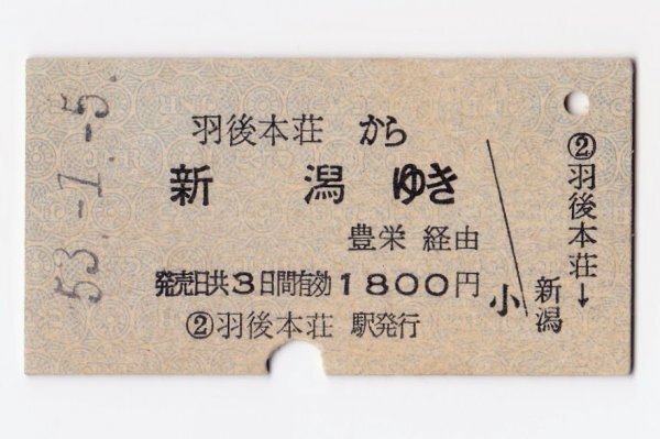●国鉄●羽越本線【 羽後本荘から新潟ゆき 豊栄経由 1800円 】A型券 昭和53年 羽後本荘駅発行【01327】