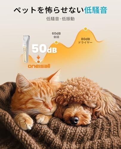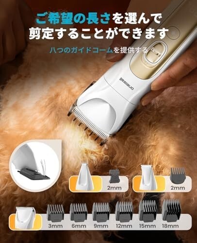 【低騒音でコードレスの使用】この犬 バリカンは、犬、猫、その他のペット向けに特別に設計されています。犬の毛用バリカンの騒音レベルは 50 デシベル以下ですので、ペットを驚かせることはありません。 注意:ペットが普段から音に敏感な場合は、まず製品のスイッチを入れて、犬、猫、その他のペットに音に慣れさせてから毛のトリミングを行ってください。犬、猫、その他のペット が驚かないようにしてください。