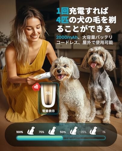【複数ペットを飼う家庭に最適なPro犬 バリカン】:2000mAhのバッテリー搭載で、連続220分間使用可能。たとえ3匹のペットを連続で刈り込んでも、電量不足の不安はありません。 Pro版の7000回転数により、犬、猫、その他のペットの剃毛や爪磨きの時間を短縮できます。ティードルのような縮れ毛の犬種でも、スムーズに作業を進めることができます。