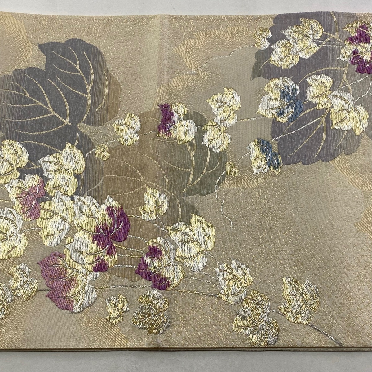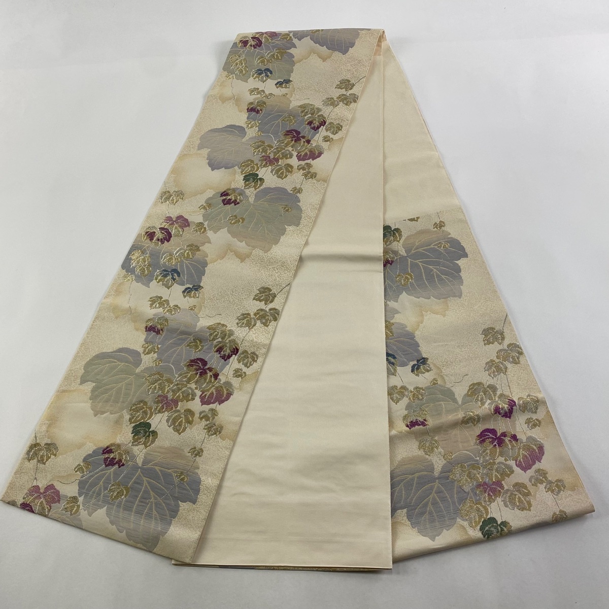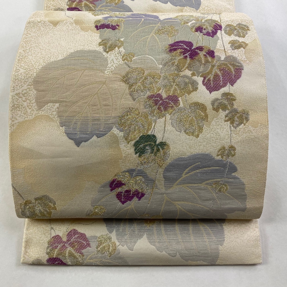 | 袋帯 美品 逸品 じゅらく 落款 帝王紫 やまと 葉柄 蔦 金銀糸 ベージュ 六通 正絹 【中古】 |