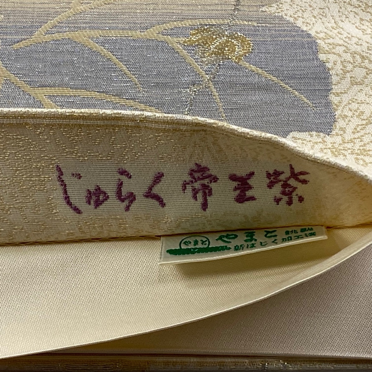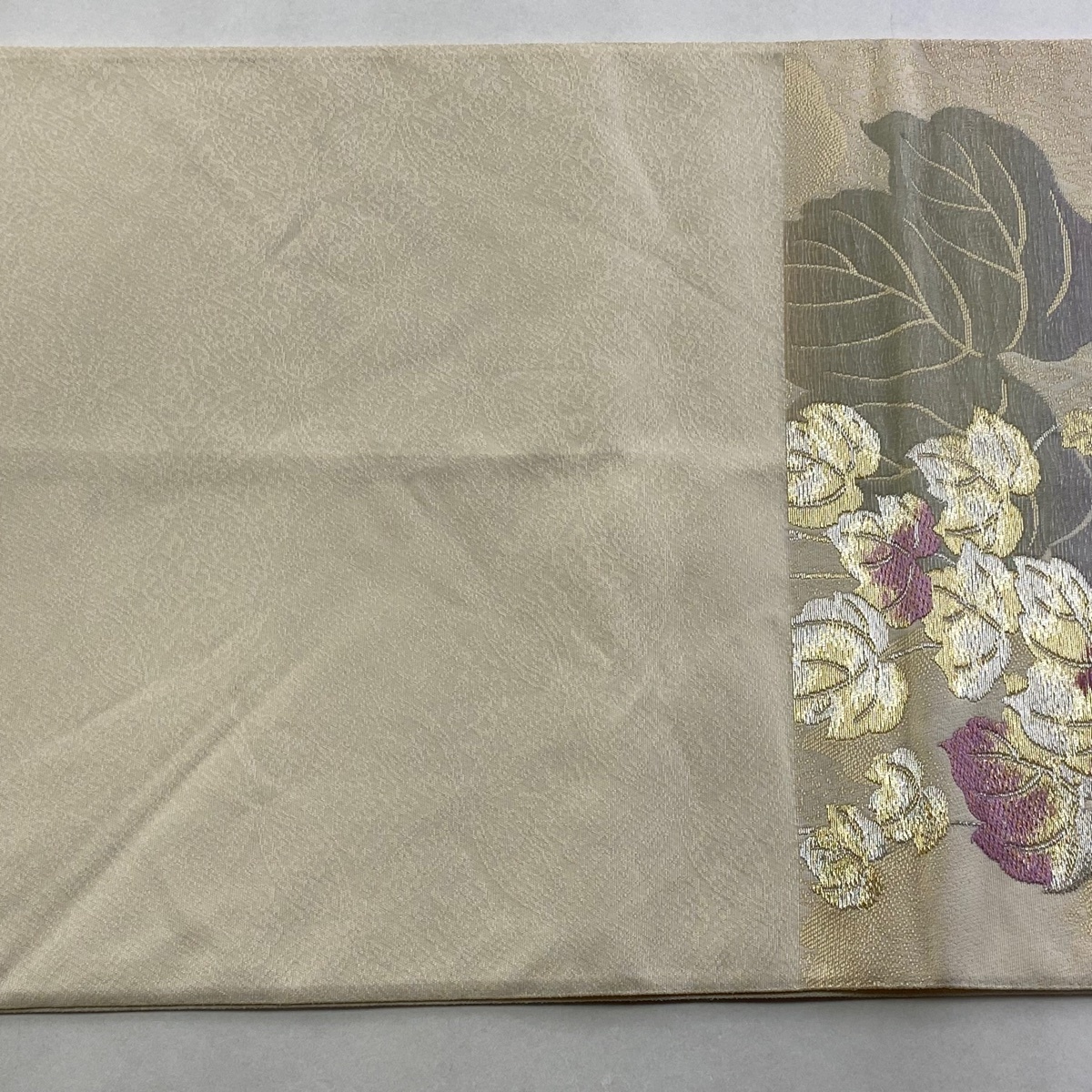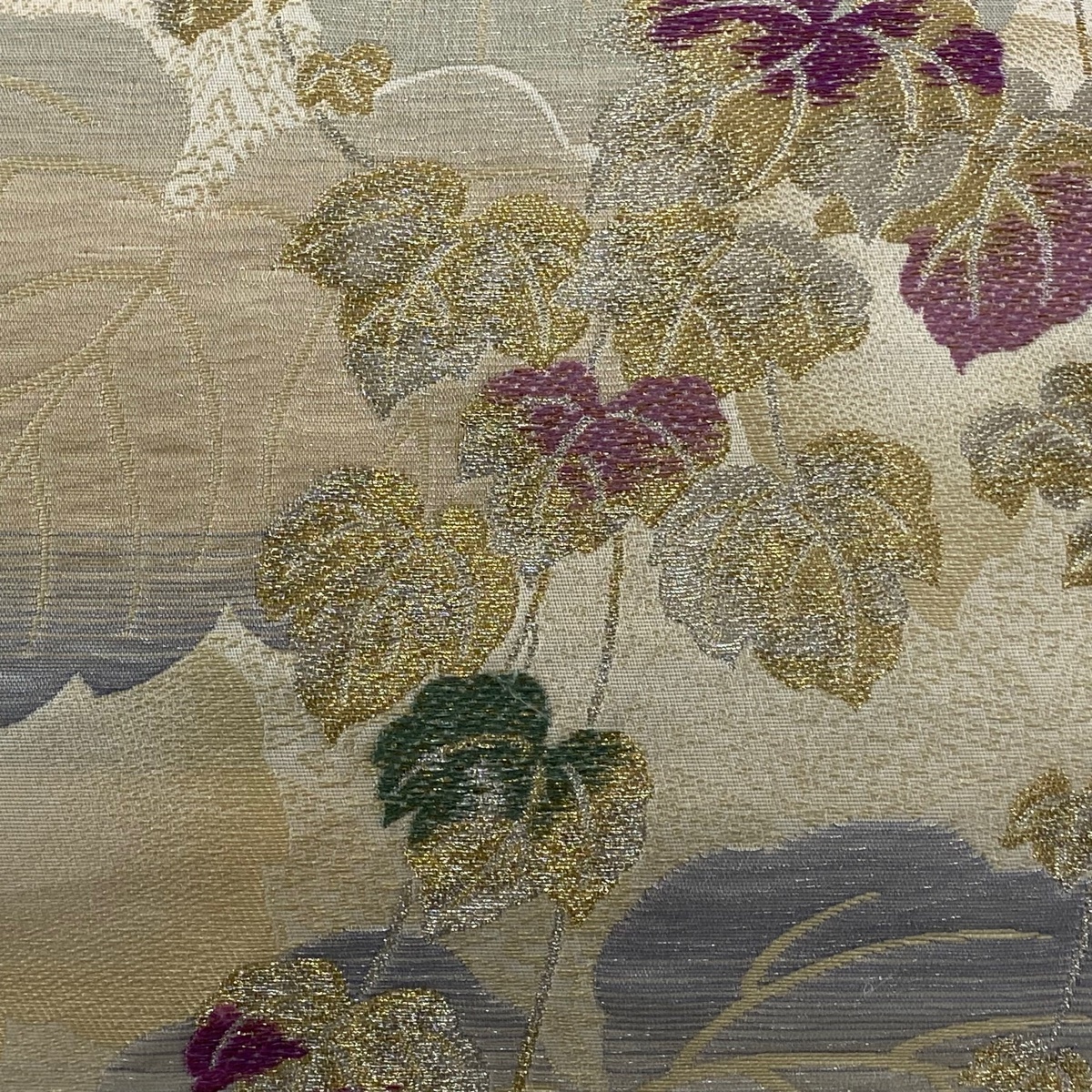 | 袋帯 美品 逸品 じゅらく 落款 帝王紫 やまと 葉柄 蔦 金銀糸 ベージュ 六通 正絹 【中古】 |