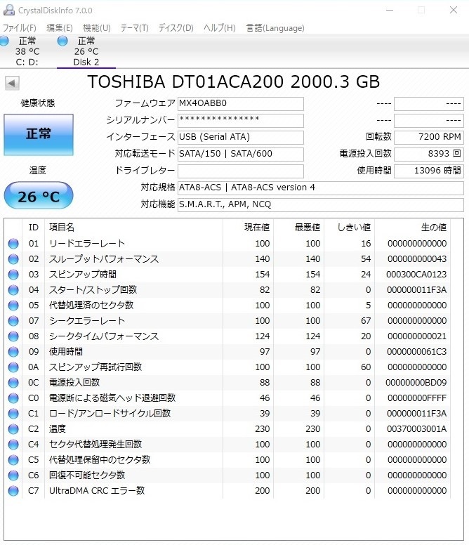 ■HDD/東芝製   (使用時間:13096時間)長期間使用可能と思います。