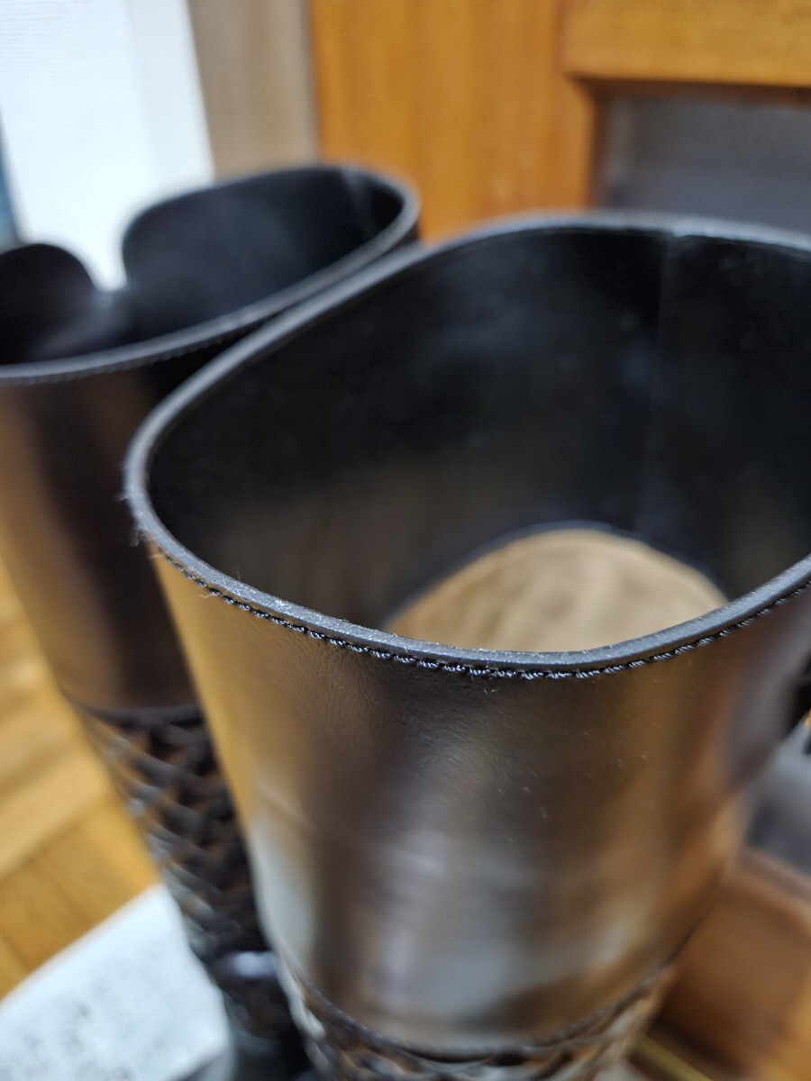 筒はキルティングデザインのパテントレザー、上部はレザー