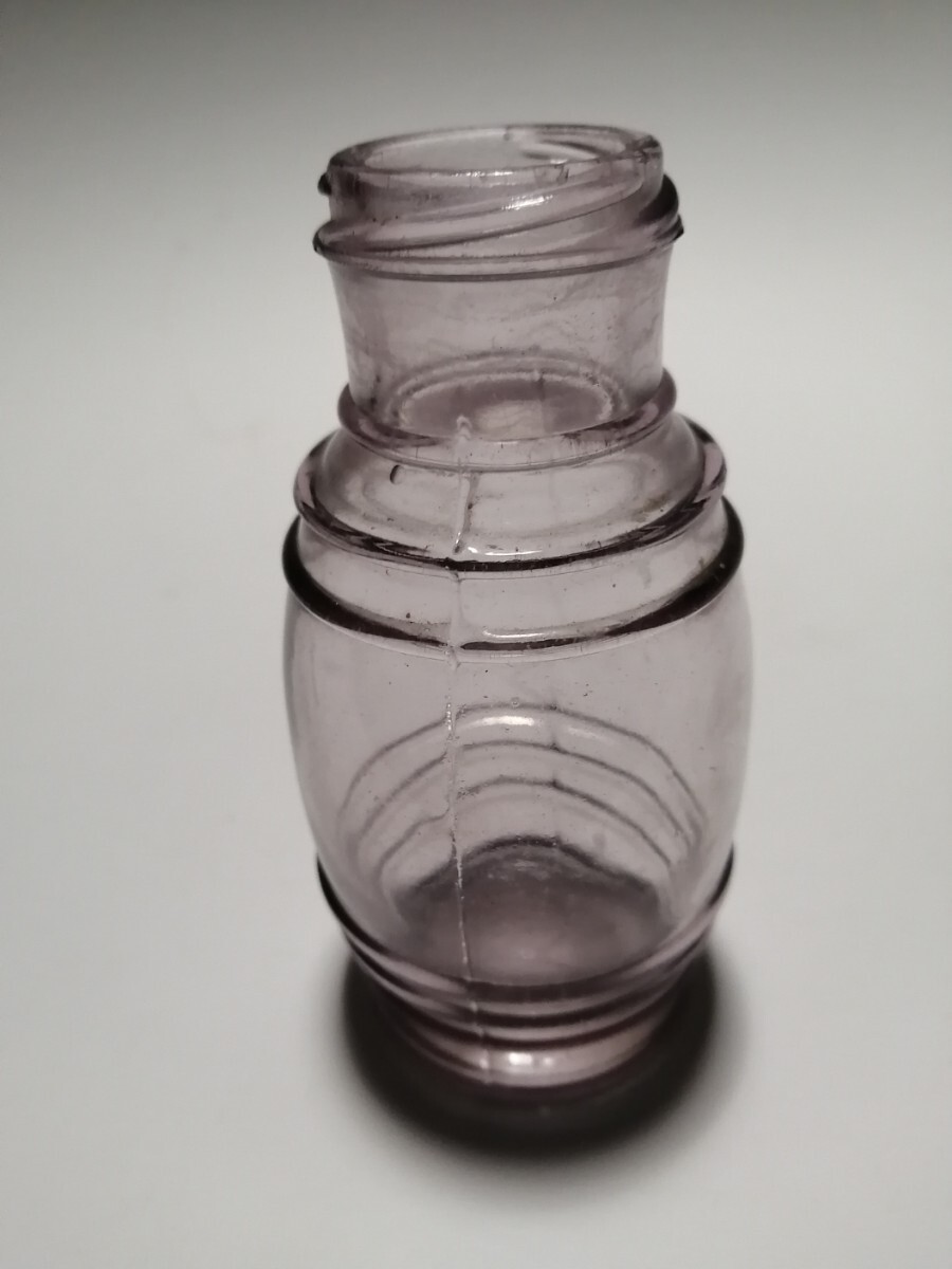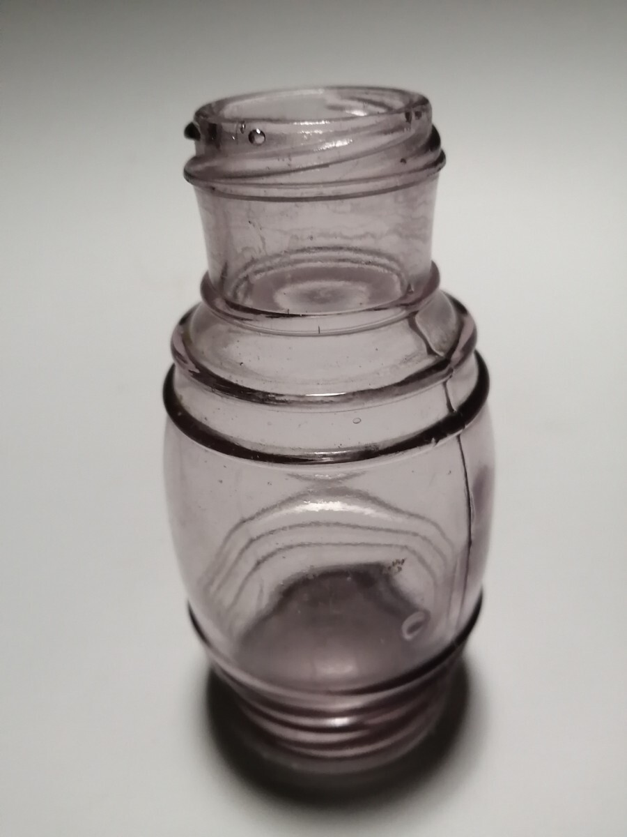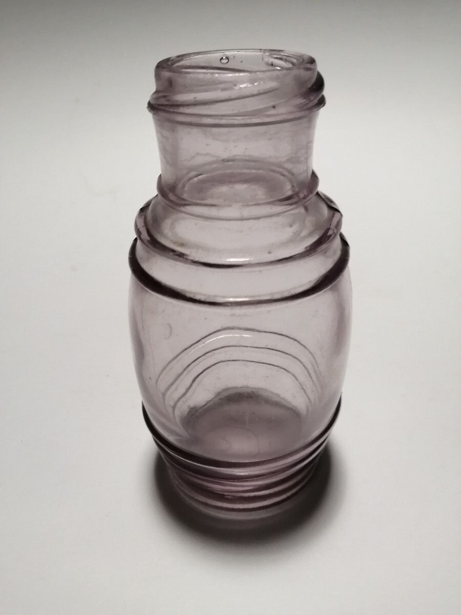 1920年代アメリカの色ガラスの瓶です。魅力的な薄い紫色のガラスで、段差のあるまろやかな姿をしています。口にキャップのネジがあり、化粧水などの容器と思われます。底に[801]の刻印があります。口径3.3㌢胴径6.3㌢高さ12.3㌢170㌘
