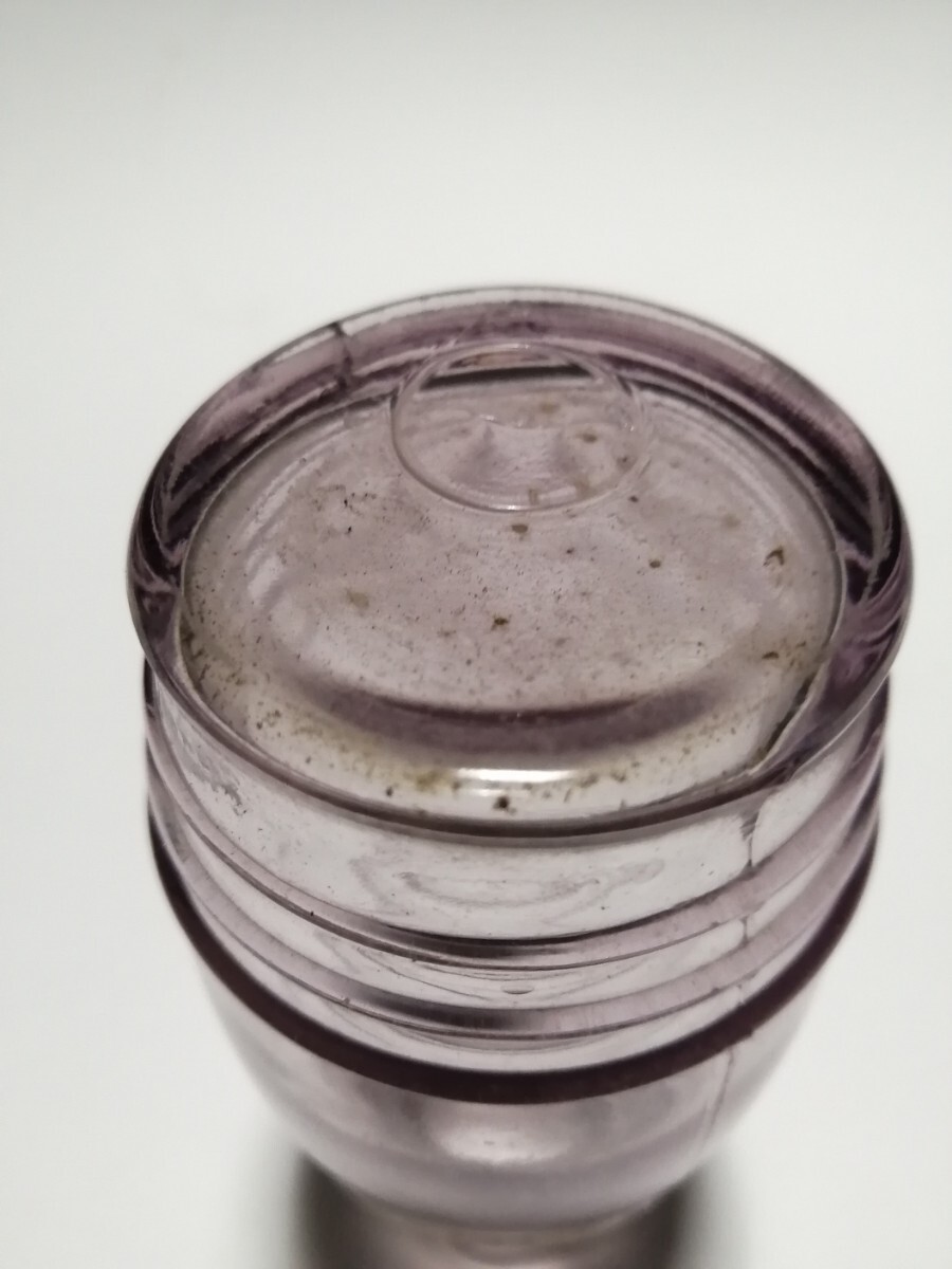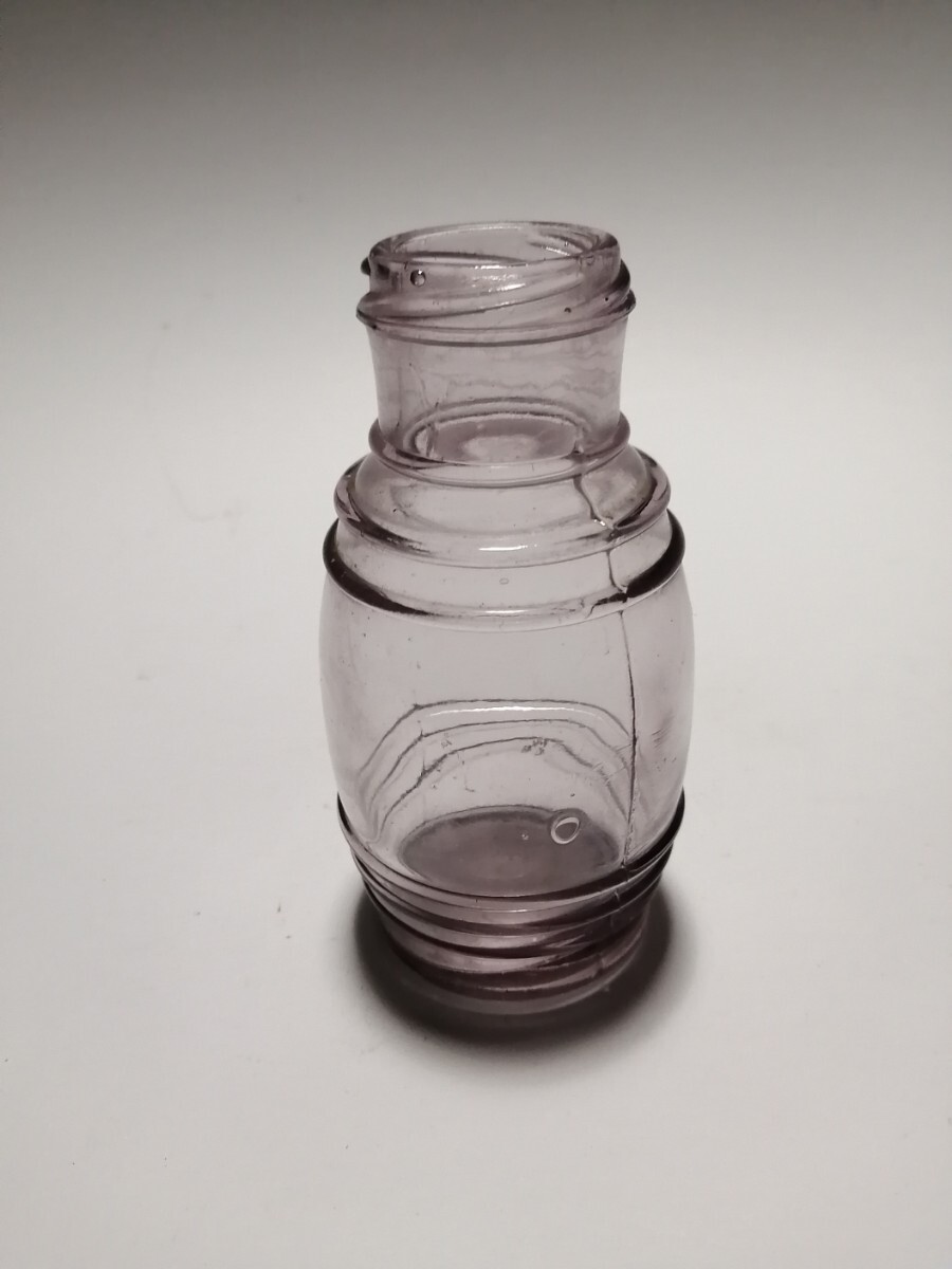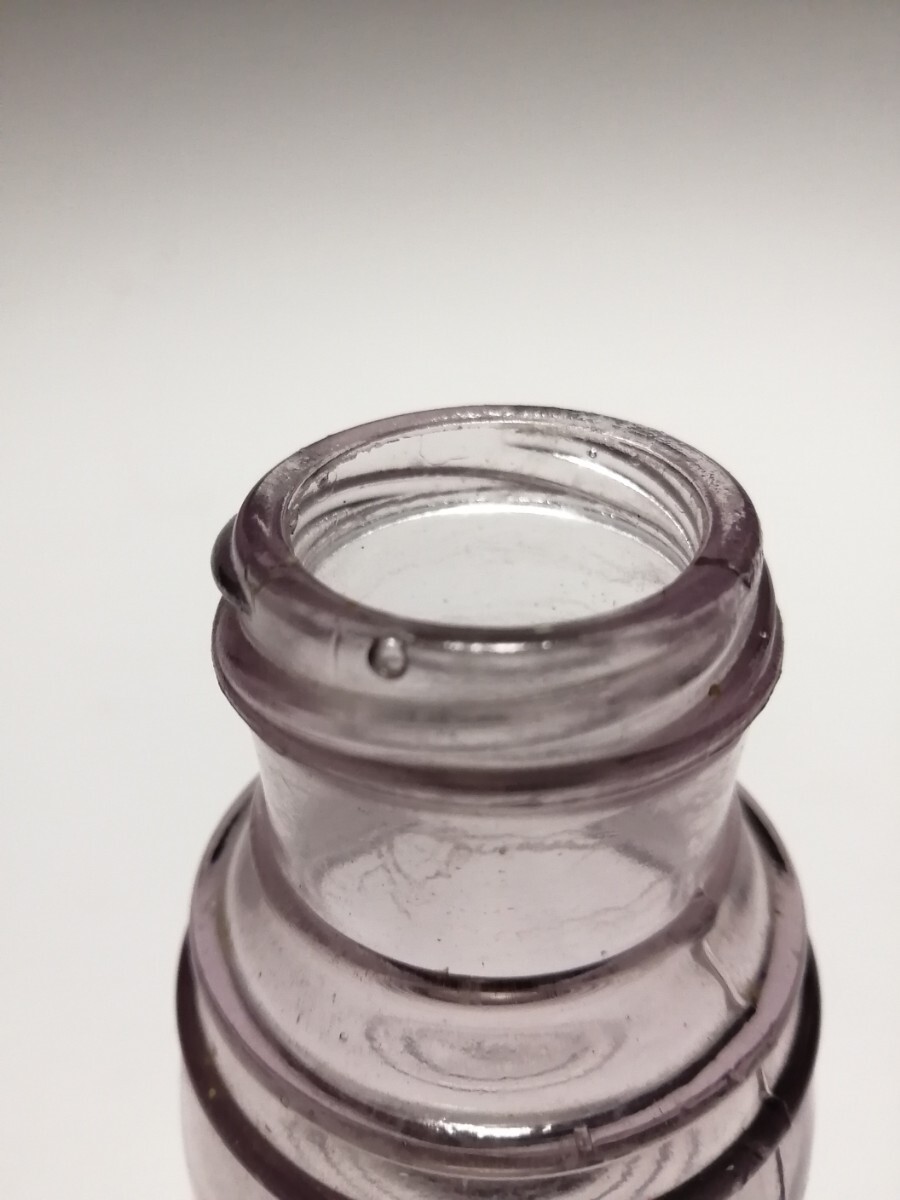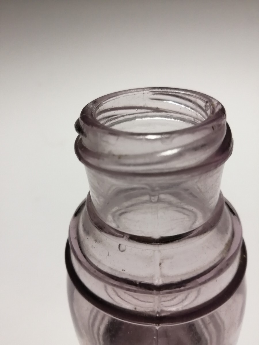 1920年代アメリカの色ガラスの瓶です。魅力的な薄い紫色のガラスで、段差のあるまろやかな姿をしています。口にキャップのネジがあり、化粧水などの容器と思われます。底に[801]の刻印があります。口径3.3㌢胴径6.3㌢高さ12.3㌢170㌘