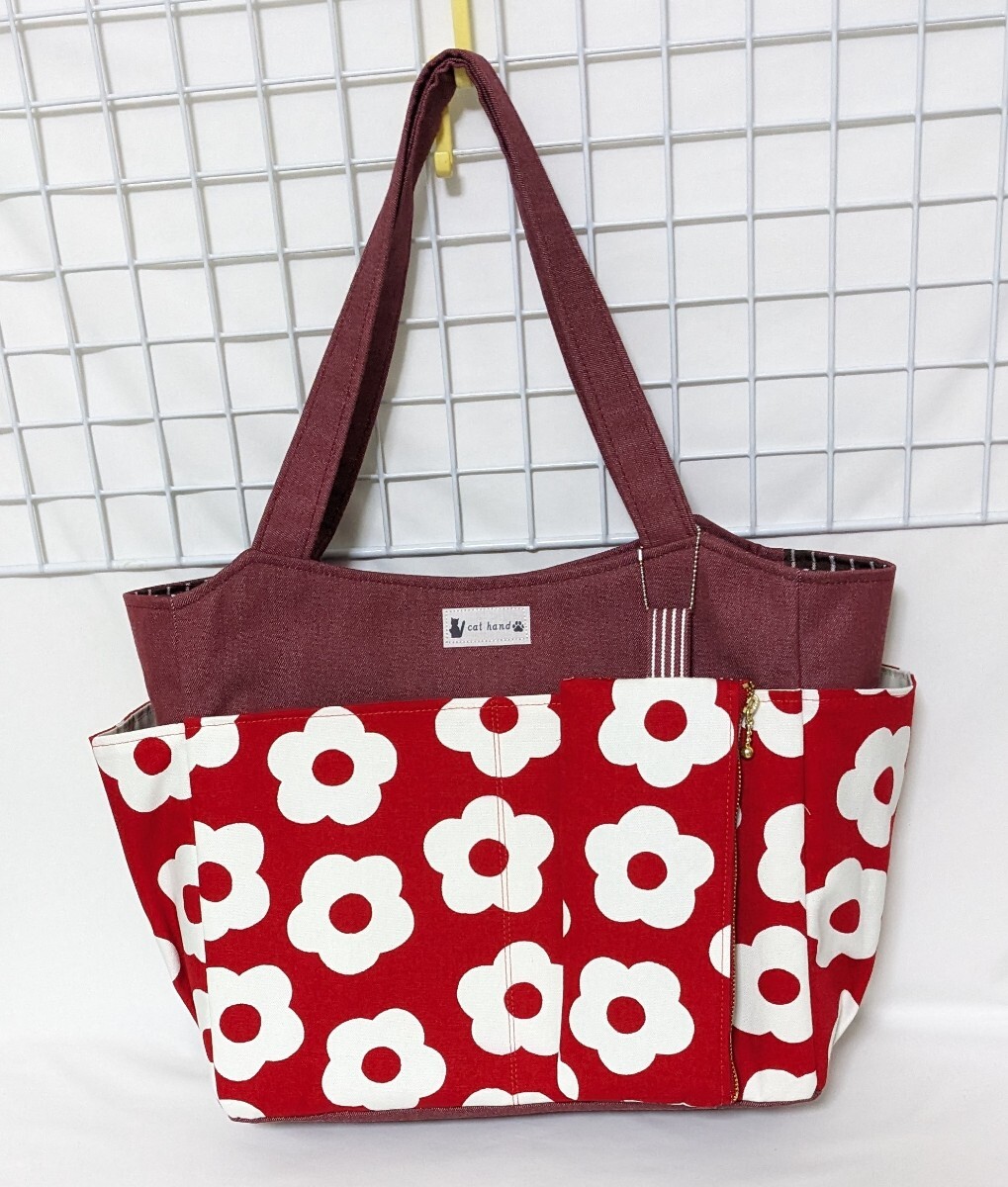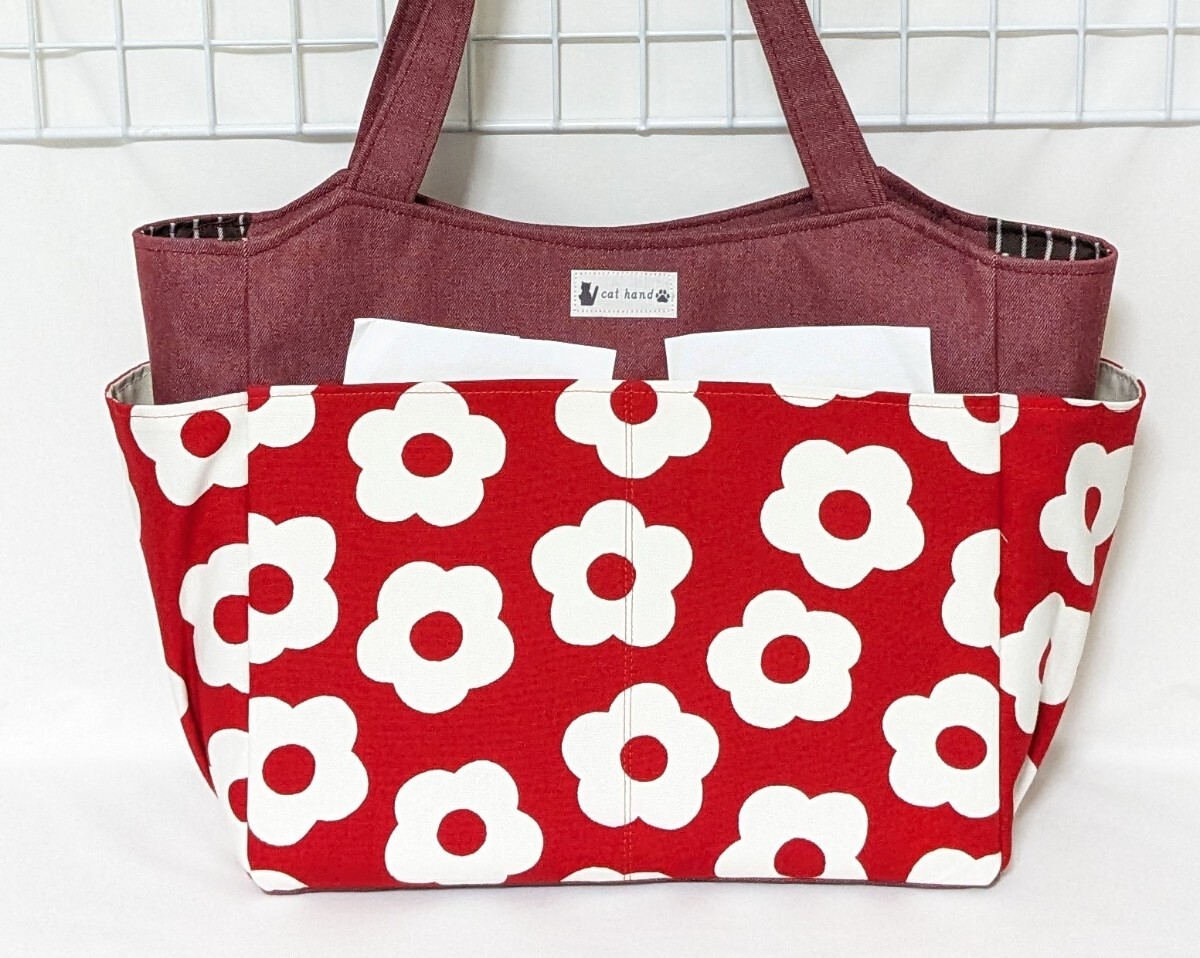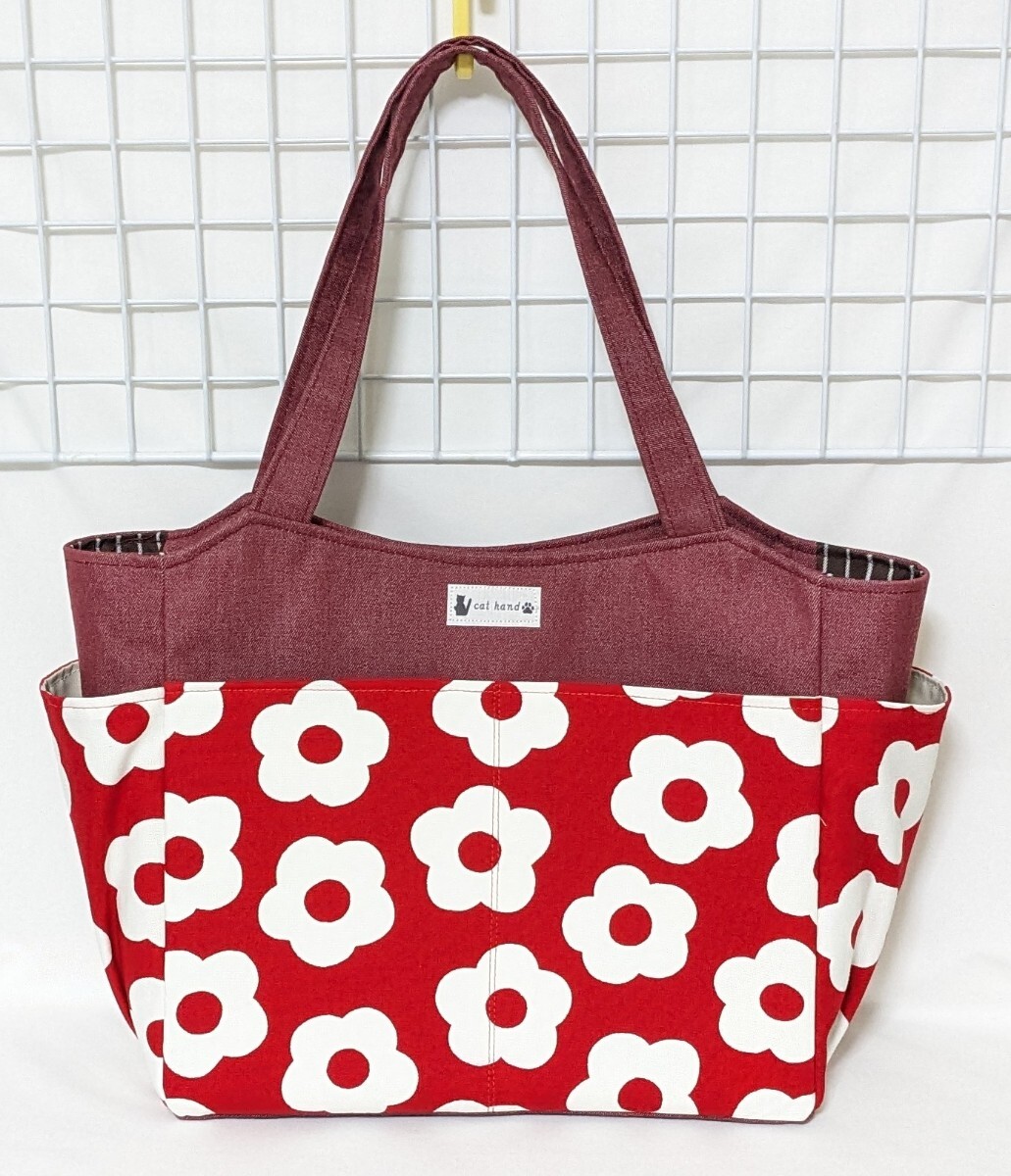 UWARI花柄・レッド・デニムガーネットのサイドポケット付きトートバッグ&ペンケース・ハンドメイド