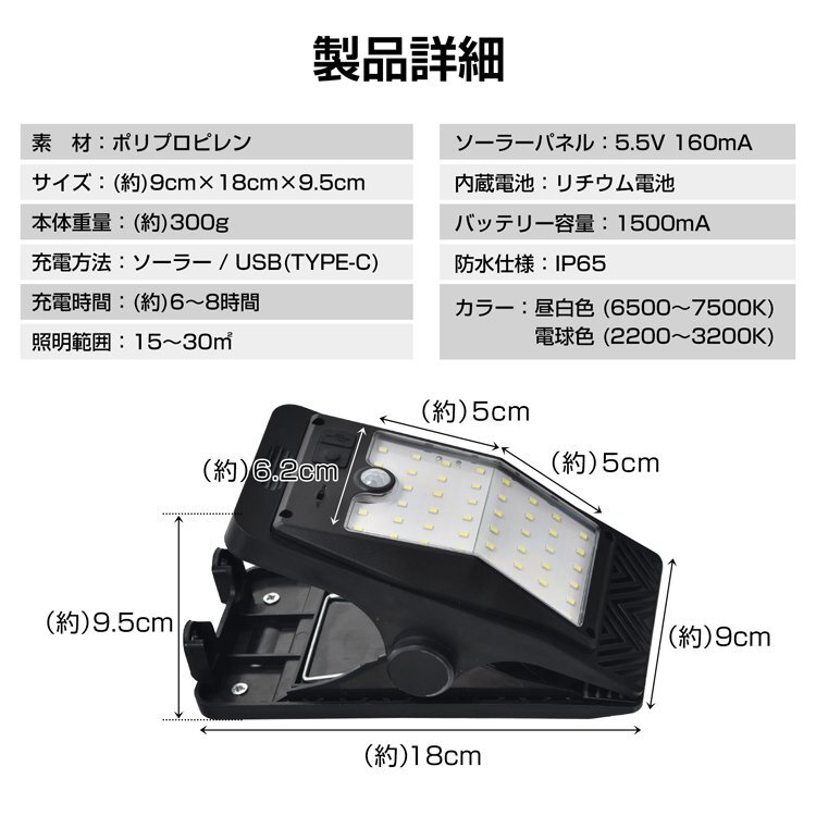 1円 ソーラーライト ガーデンライト クリップ式 センサーライト 人感センサー 自動充電 USB充電 防塵 IP65 LED リチウム電池 sl106