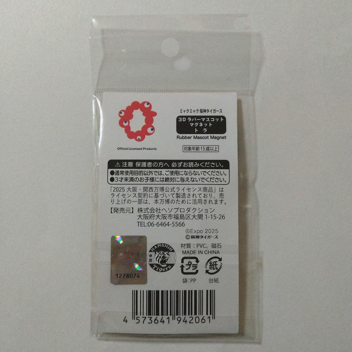大阪・関西万博公式ライセンス商品、ミャクミャクと阪神タイガースコラボのラバーマスコットマグネットです。