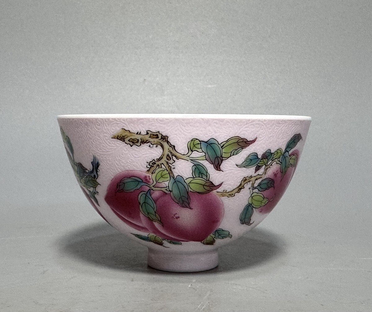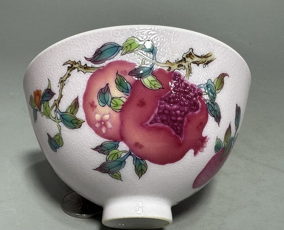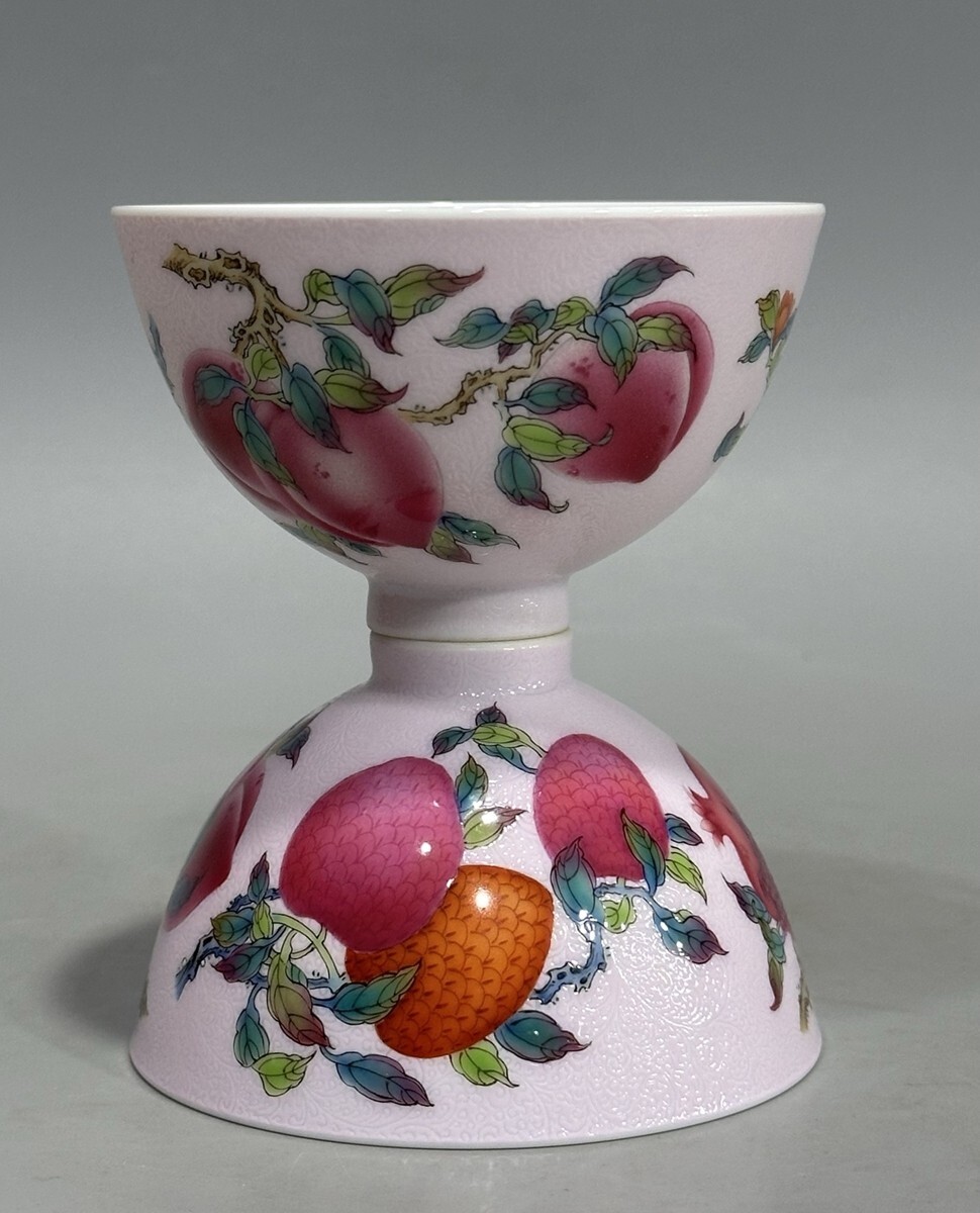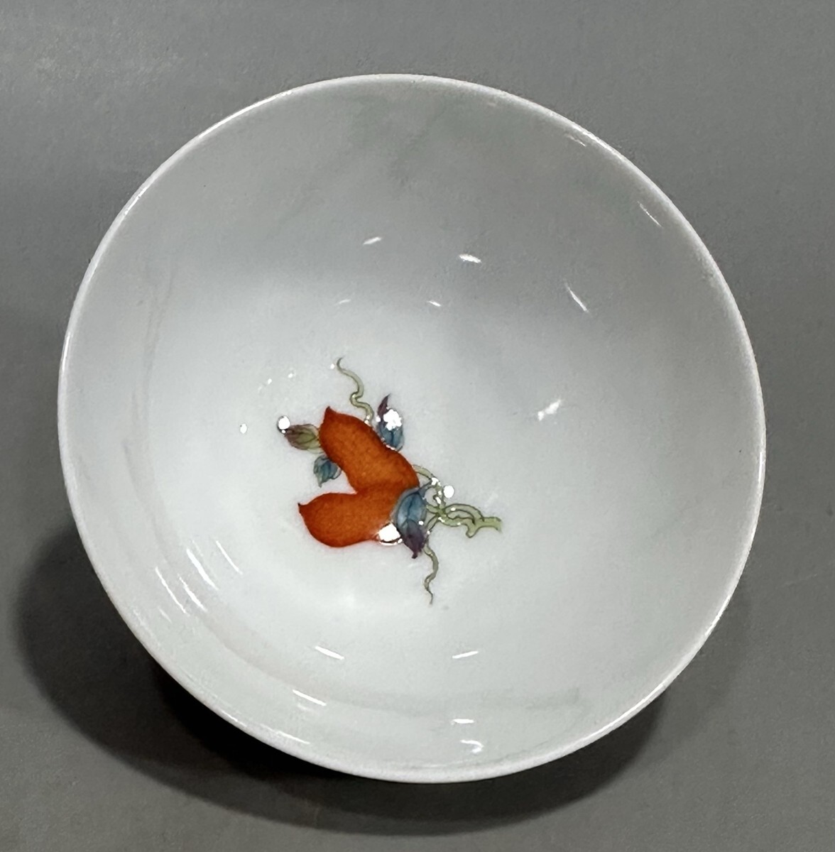 「清 乾隆年製 陶磁器 臙脂水爬花三果紋 杯一対」染付 置物 擺件 古賞物 中国古美術 旧蔵出
