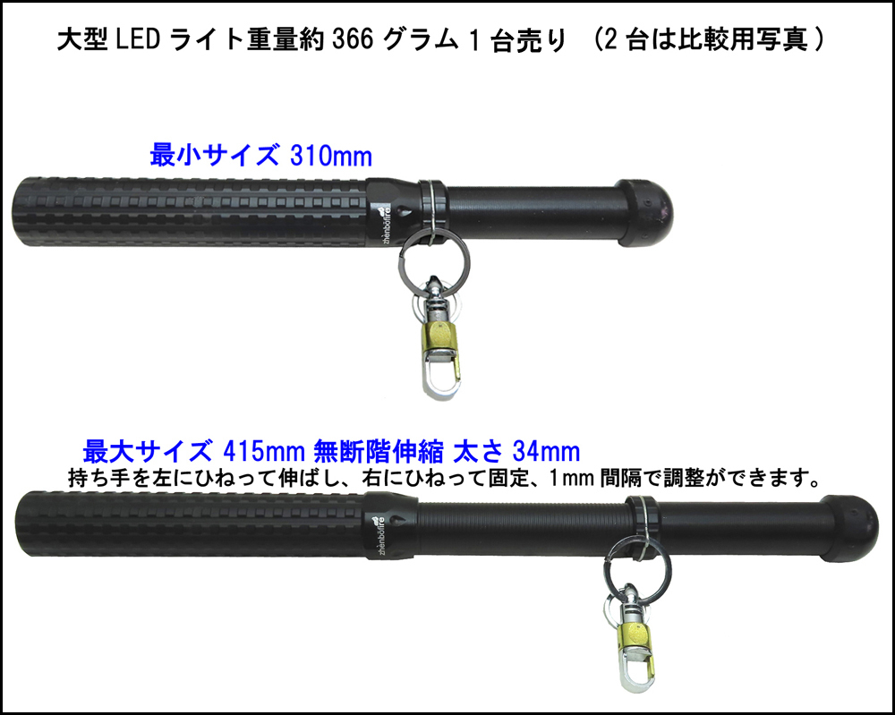 ■懐中電灯5 LEDは世界最高クラスのCREE社製 LED 採用。 ■世界の軍隊・警察機関でも使用されるという強力ライトです。 ■懐中電灯 こん棒タイプ 警棒型 大型LEDライト 電池単4(3本付)及び リチウムイオン充電池&充電器付 ■リチウムイオン充電池 UltraFire 18650 3000mAh 1本(スペーサー付き)と専用充電器付き ■アルカリ乾電池単4(3本付)は専用電池アダプターに入れて使用します。 ■リチウムイオン充電池の充電が少ないときは単4電池3本を電池アダプター に入れてご使用頂けます。 ■リチウムイオン充電池と単4専用電池アダプターは同時にはご使用出来ません。 ■大型LEDライト サイズ 310mm~415mm無断階伸縮 太さ34mm 重量約366グラム(電池なし) ■持ち手を左にひねって伸ばし、右にひねって固定、5mm間隔で調整ができます。 ■照射モードは3段階(ハイ・ミドル・ストロボ) ■材質 T6061 アルミニューム 削りだし製品。 ■日常生活用防水加工 ちょっとした雨の中 又は水しぶきにも壊れにくい。 ■この大型LEDライトで物をたたいたりすると壊れますので叩かないで下さい。 ■付属品 ■単四アルカリ乾電池x3本 専用アダプターx1 ■リチウムイオン充電池 18650 3000mAh UltraFire x1本(スペーサー付x1) ■UltraFire 専用充電器x1(100V~240V対応3.7V/450mA) ■輸入品に付、箱に キズ ヘコミ などありますので気になる方はご遠慮ください。 ■防犯ライト 夜間護身用として安心してご愛用していただけるとおもいます。 ■護身用 アウトドアや停電時の備品としてもあるといつも安心です。 ■安心の為に、壁にぶら下げてください。または車中にあると安心です。 ■夜間警備 ボディーガード 緊急時 災害時 アウトドア 携帯用 痴漢撃退 ■完全点検の上出荷いたしますのでご安心下さい。 ■輸入品に付きキズ ヘコミ などありますので気になる方のご購入はご遠慮下さい。 ■電池交換については、最低限の知識と技術のない方はご遠慮下さい。 ■取扱い説明書はありませんので分かる方のみご購入をお願いします。 ■保障期間 はありませんのでご注意下さい。 ■届きましたらライトの点灯テストしてください。 ■不良品の場合、お送り下さい、交換いたします。 ■大変申し訳ありませんが送料はご負担下さい。粗品をつけて返送致します。 ■メーカー希望販売価格 \10,000円+税 外部リンク その他のLED ライト 外部リンク その他の懐中電灯 ●20230205-80● 出品数が多い為、質問覧からの質問はご遠慮下さい。 質問は大変申し分けありませんがお電話でのみ受けております。 出品者へ質問されて来た方は今後一切の入札が出来なくなりますのでご注意下さい。 ■在庫は有る物として出品しておりますので在庫確認はご遠慮下さい。 ■掲載写真が変更又は追加をすることがありますので定期的に画面を更新してください。 ■新規の方、評価の低い方は入札されますと取消しますのでご了承下さい。 ■悪い評価のある方は入札を取消す場合がありますのでご了承下さい。 ■領収書 納品書 請求書 の発行は行っておりませんので予めご了承ください。 ■商品到着後、直ぐに受け取り連絡をしていただける方のみ入札をお願い致します。 ■受け取り連絡を直ぐにして頂けない方は次回から入札をお断りさせた頂きます。 ■この商品の送料 ヤマト宅急便 80サイズになります。 宅急便 本州 四国 九州 770円(離島含む) 宅急便 宮城 山形 福島 860円(離島含む) 宅急便 青森 秋田 岩手 980円(離島含む) 宅急便 北海道 1400円(離島含む) 宅急便 沖 縄 1540円(離島含む) ■複数 入札 (同梱) ■落札された時点で入札されているものを複数(同梱可能)とみなします。 ■落札後に入札されたものは複数になりませんのでご注意して下さい。(同梱不可) ■複数入札されている方は.1つ目終了後.のこり分を終了させて頂く場合もあります。 ■運送便の送料は複数落札されてもサイズが変わると送料も変わって来ます。 ■複数落札された方は まとめて取引 で送料を連絡させて頂きます。 ■同梱できないサイズも有りますのでご注意下さい。 ■注意 ヤマト宅急便において沖縄県の場合、普通は航空輸送になりますがヤマトの勝手な 判断で危険物と思われる物は航空便にできないと判断して、陸海上輸送になる場合があります。 その場合通常より1週間程度お届けが遅れます。(事前連絡はありません。) お急ぎのかたは余裕をもってお早めにご注文して頂けますようお願い致します。 ■同梱の場合サイズにより送料が変わります。 ■希望があれば佐川急便及びヤマト宅急便のみ送料着払いも可能です。(選択可) |