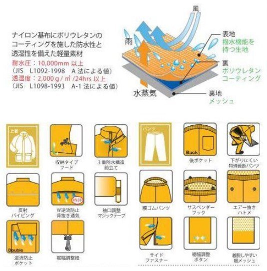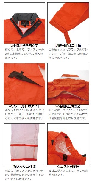 《上着》総裏メッシュ、袖口マジックテープ付き、裾ロック付きスピンロール、裏襟トリコット仕様、フード襟収納可、背抜き&反射パイピング付き、逆流防止Wフォールポケット