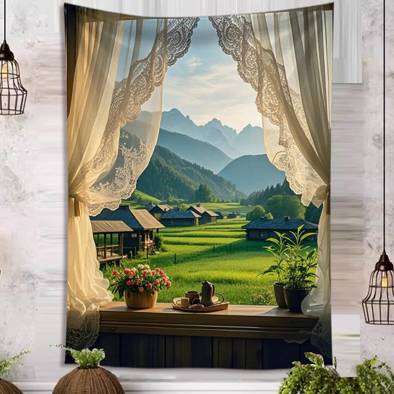 タペストリー 壁飾り 壁掛け装飾布 布ポスター 部屋飾り 背景布 インテリア カーテン 窓と穏やかな田舎の絵柄 70x100cm