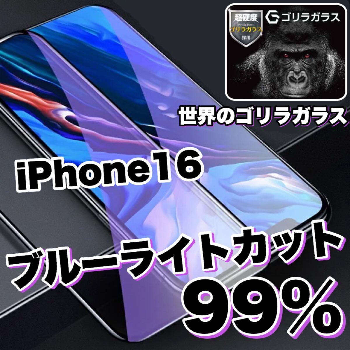 目に優しい!!【iPhone16】ブルーライト99%カットガラスフィルム《世界のゴリラガラス》 iPhone保護フィルム