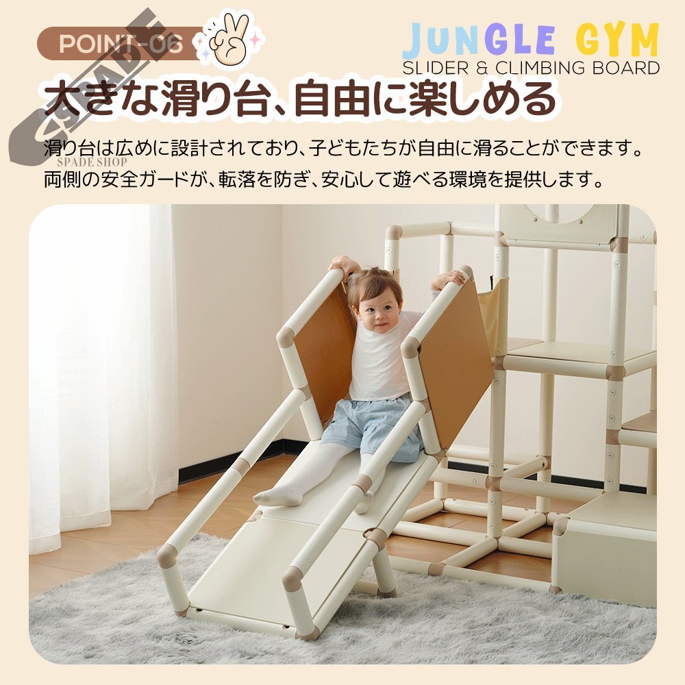 • 【大きな滑り台、自由に楽しめる】滑り台は広めに設計されており、子どもたちが自由に滑ることができます。両側の安全ガードが、転落を防ぎ、安心して遊べる環境を提供します。